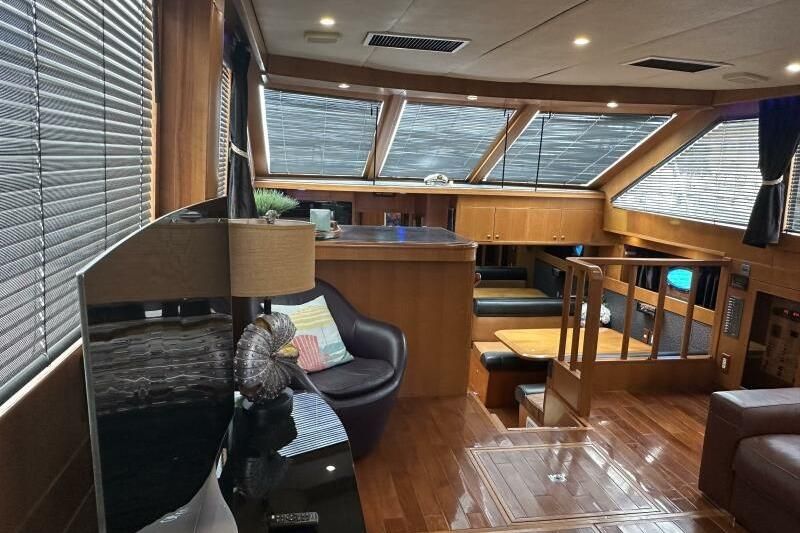 The aft deck is ideal for entertaining, complete with a U-Line ice maker/refrigerator and wet bar. Throughout the vessel, the teak interior is in pristine condition, reflecting the exceptional care she has received.