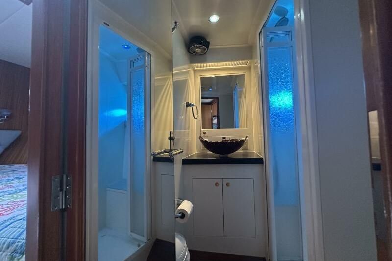 Aft, the master stateroom features a king-size berth, extensive storage, and a spacious ensuite head with custom fixtures, dual sinks, and a full bathtub/shower.