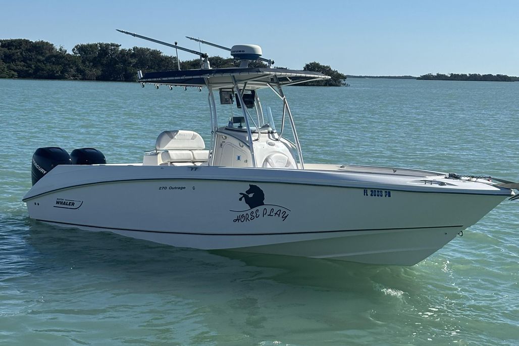 This 2006 Boston Whaler 270 Outrage is a remarkable saltwater fishing vessel that combines performance and comfort. With an overall length of 27 feet, this boat features a robust fiberglass hull designed in a Deep Vee shape, ensuring stability and agility on the water.