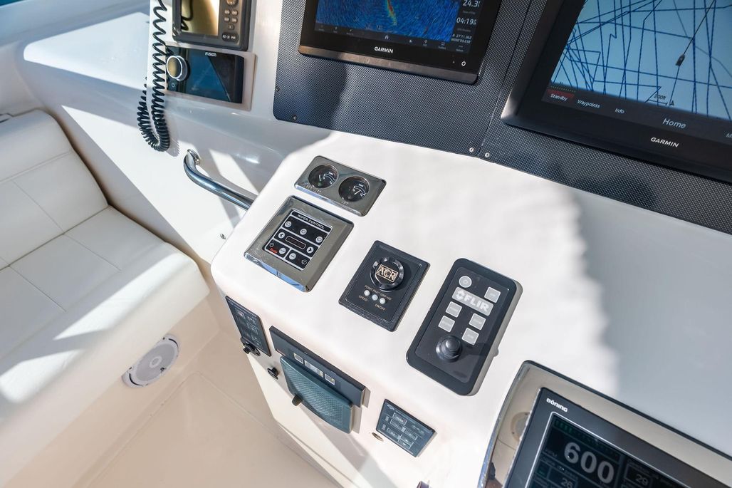 HELM STATION - The helm of the Cabo 45 Express reflects the vessel’s generous size, offering ample space for both the pilot and guests to enjoy a comfortable ride. The custom-designed fiberglass console is both functional and stylish, while the ultra-leather upholstery provides a durable yet luxurious touch. Visibility is a priority, with a large three-pane windshield equipped with oversized wipers on each pane to ensure clear sightlines in all conditions. An electrically operated center vent comes standard, enhancing airflow and comfort at the helm.