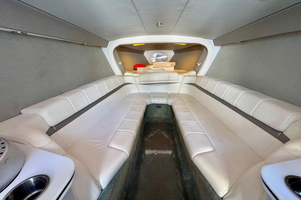 Below deck, you’ll find a surprisingly comfortable cabin for a performance boat, complete with wraparound seating, a V-berth, and storage—perfect for day trips or quick overnight stays.