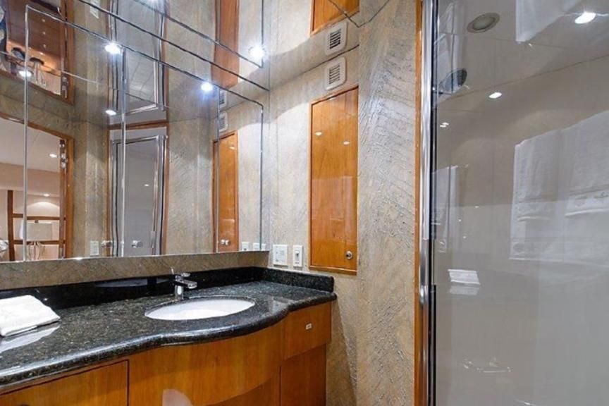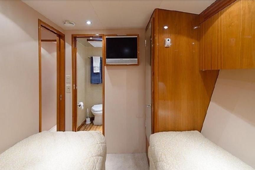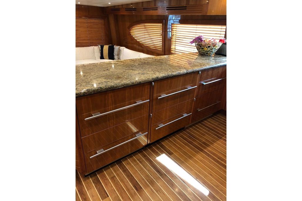 The 68c has proven to be one of the most comfortable boats in its class. The convex hull will give you a smooth ride even on high seas, especially on this enclosed version, where you will be riding in the comfort of air condition, and the ability to hold a conversation without the engine roar. Given the 68's displacement, Hatteras' reputation for building a stout boat is clearly intact. While other production builders have fiddled with lightweight structures, Hatteras has always favored practical and proven methods. The 68's hull bottom is solid fiberglass supported by a fiberglass stringer system and Divinycell foam-cored bulkheads. Coring is used to stiffen the hullsides, decks and superstructure. Like all Hatteras yachts, the 68's molded gelcoat finish is prepped and painted in a state-of-the-art coating facility.