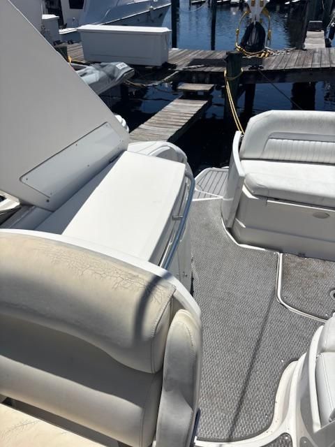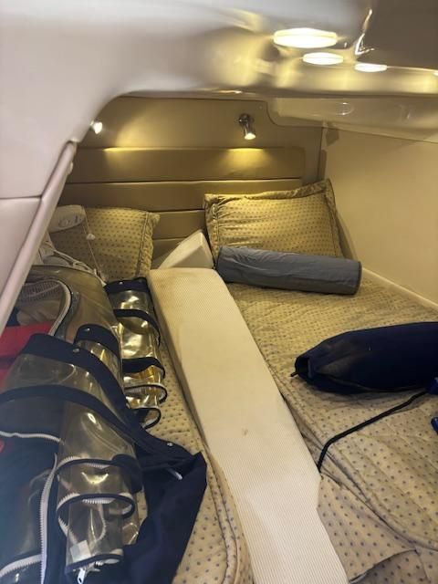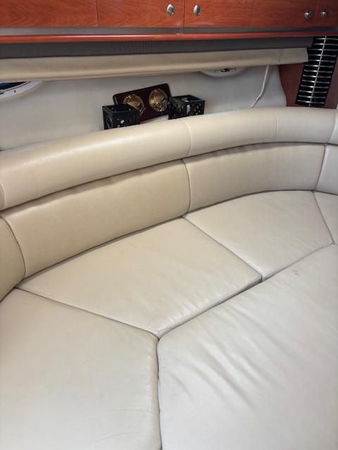The 350 Sport Yacht is a seamless blend of performance, comfort, style and sophistication. The starboard refreshment center comes complete with full length stainless steel grab rail and convenient 120 volt outlet. The wet-bar includes drink holders, sink with faucet, 48 quart cooler, and ample storage! The impressive above deck layout only hints at the sumptuous accommodations waiting below. A roomy salon welcomes you and the spacious galley is fully equipped. An exceptionally large head compartment with mirrored vanity, vacuflush toilet and a full stand up shower make you feel at home. Mid Cabin: Perfect for guests, the midships twin berth converts quickly to a queen bed. Color-coordinated, quilted mattress covers provide stylish comfort and the swivel/extension mount permits TV viewing from entire suite. Mid Cabin Lounge: The mid-cabin has a contoured sofa/chaise lounge, hanging locker and built in storage for electronics. Aft Seating: The lower cockpit U-shaped lounge seating lends itself to total passenger comfort. A cockpit table installs easily to turn the aft seats into an al fresco dining area! The Salon: A curved sofa/dinette is just the place to relax or dine indoors. For overnite guests, the sofa converts into comfortable sleeping accomodations for two. The salon has a flat panel, color TV/DVD combo with remote and is mounted in the adjacent galley.
