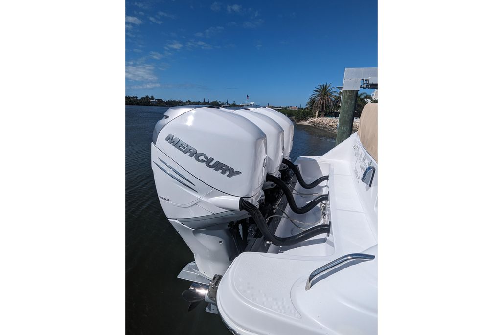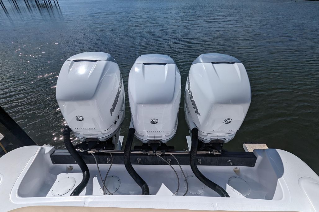 • Motors: 895 hours. Powered by triple Mercury 350 Verados, you are sure to get to your destination with speed and reliability. These Verados are controlled with the most recent electronic dual binnacle control box. All information can be seen through the NMEA network linked through the dual Garmin screens at the helm. There are also newer Mercury Smart Craft gauges on the helm.