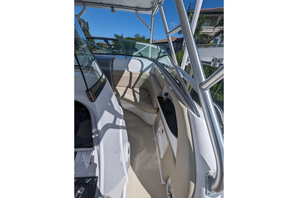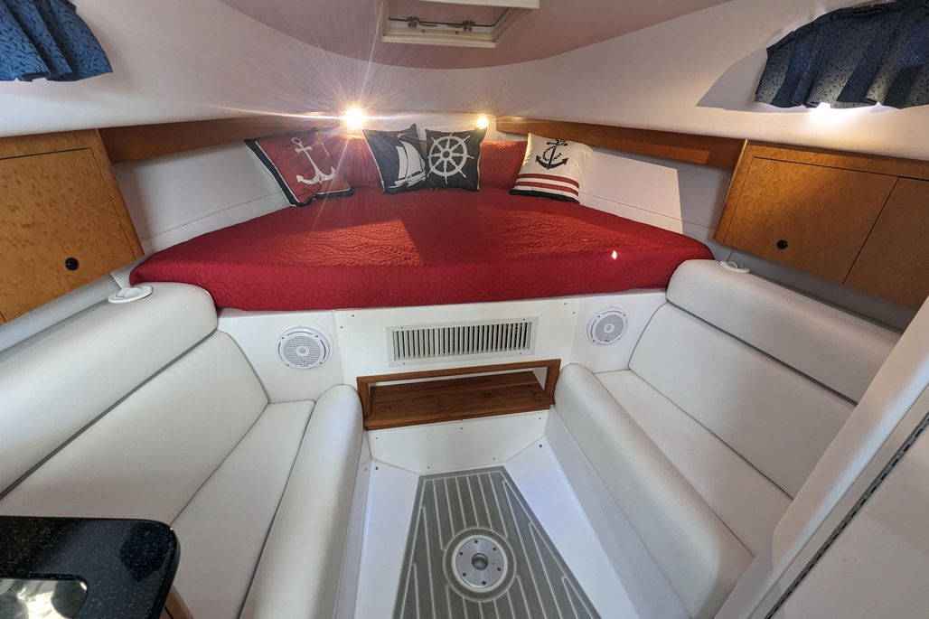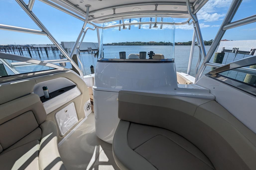 • Cockpit: Brand New Upholstery, Under Seat Frigibar Freezer, Custom Made Helm Seat with Integrated Storage, New Helm Seats w/ Arm Rests, 3 Part Epoxy on Deck Makes for Easy Cleaning