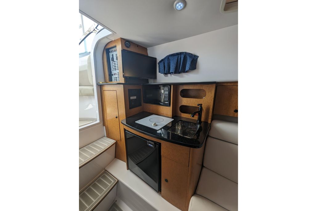 • Cuddy: Air Conditioning- (Plumbed to be able to run off dock water hose while on lift), Fridge, Stovetop Burner, Microwave, Sink, Head Compartment w/ Electric Head and Shower, Seadek Flooring