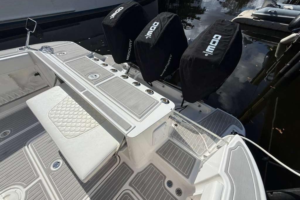 Her legendary deep-V fiberglass hull delivers a confident, dry, and smooth ride even when conditions turn challenging, making her a trusted platform offshore or along the coast. Power comes from triple 2020 Mercury V8 300hp outboards, delivering exhilarating performance, modern reliability, and efficient operation with approximately 750 hours. This setup provides outstanding speed, range, and redundancy for long offshore runs.