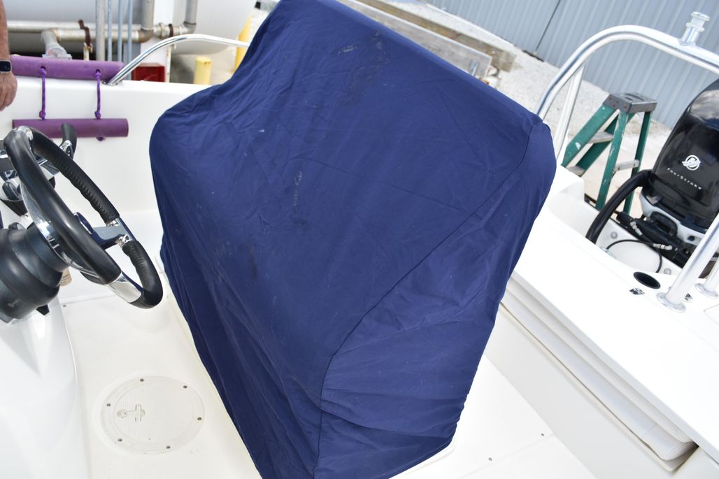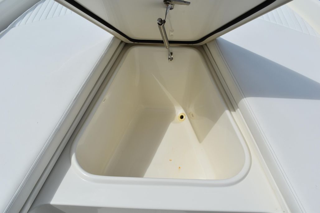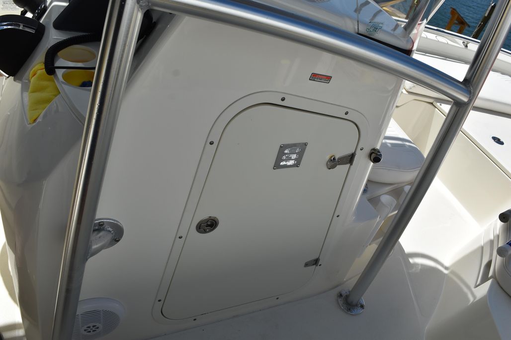 This Boston Whaler 230 is in excellent condition, with two owners since new, with service records. You can see why the Dauntless 230 is a popular design Center Console. This beautiful boat has an unblemished white hull, accented in black. It is powered with the low maintenance Mercury Verado 250 motor, with 290 hrs. An added feature of this boat is the addition of a bait box, located in the helm seat with recirculatory pump. This boat offers a spacious head with porta-Potti toilet and pressure water system.
