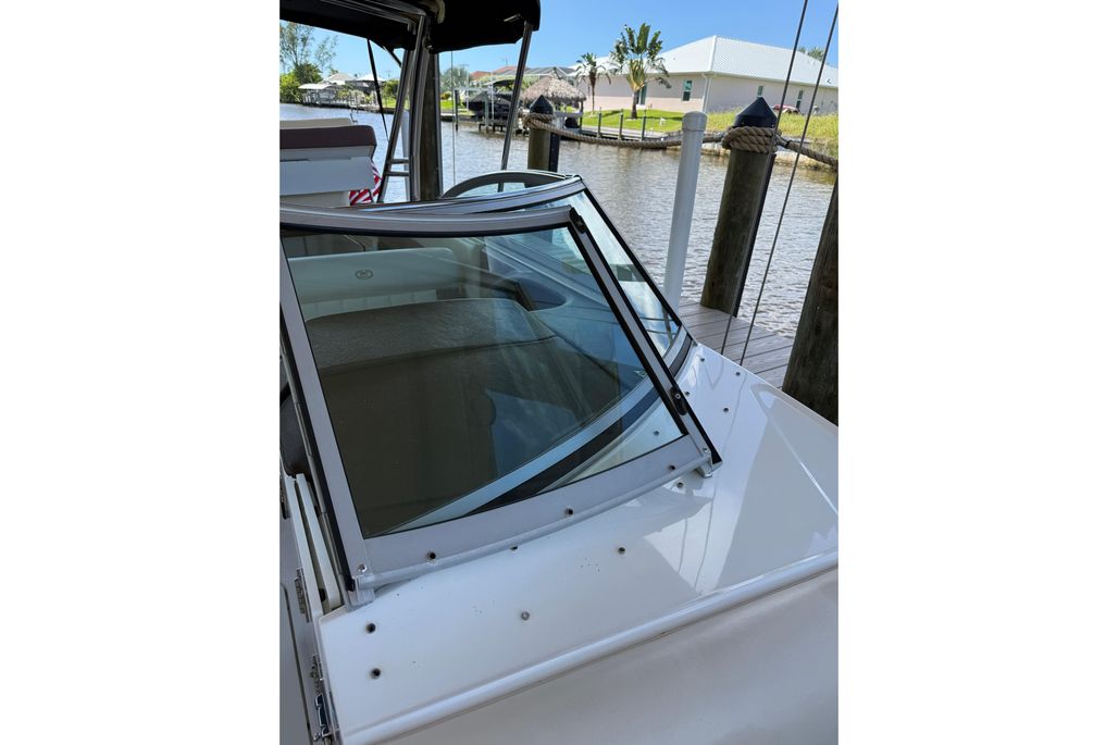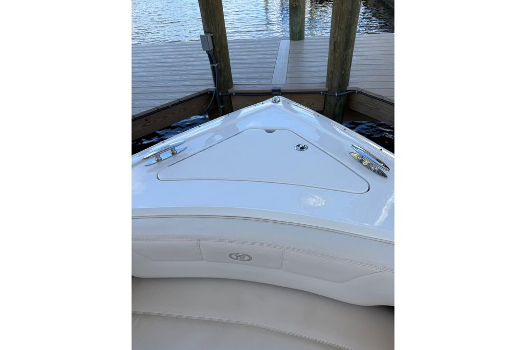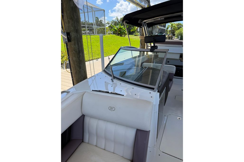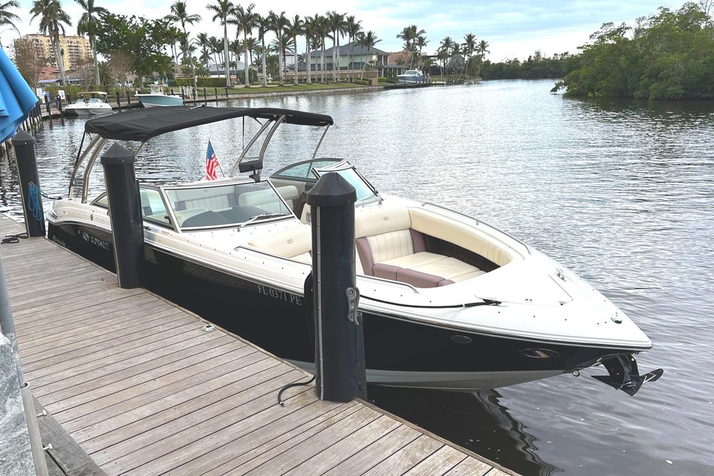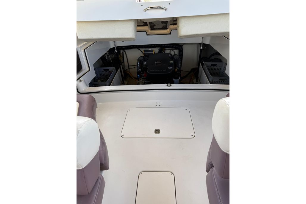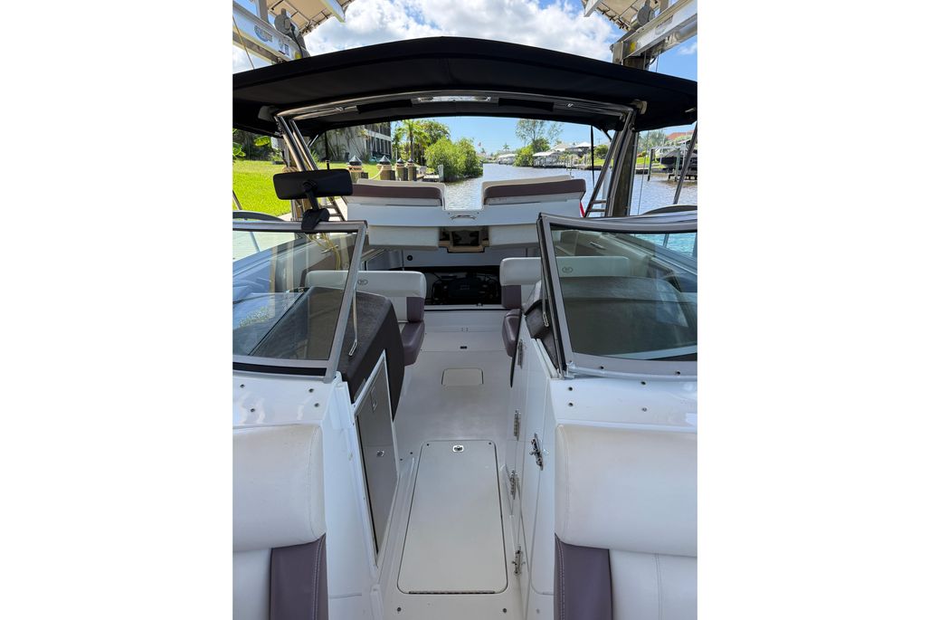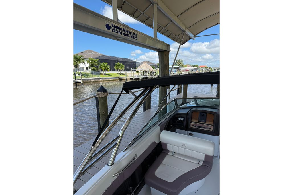This particular 296 has been kept on a covered lift, sparing her from unnecessary exposure and ensuring that gelcoat, upholstery, and canvas remain in excellent condition. With just 328 hours on her Volvo Penta 8.1L 400 HP engine, she has plenty of reliable life ahead and is truly turn-key ready.
