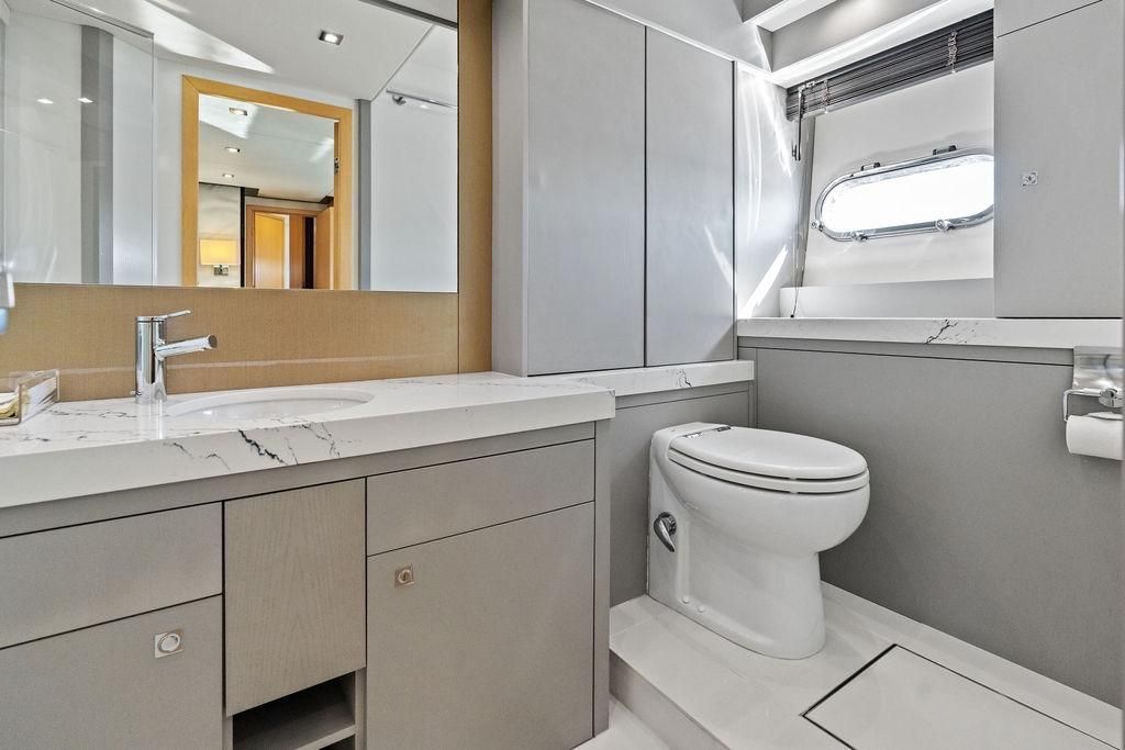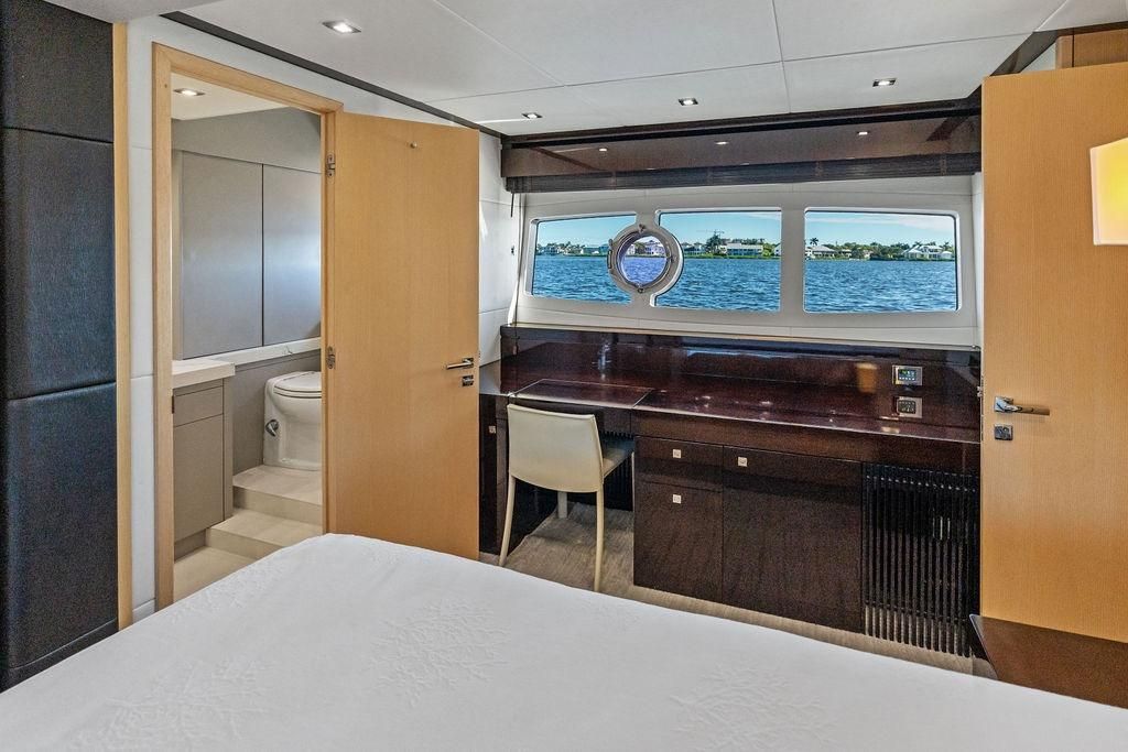 At the stern, you'll find a comfortable stateroom equipped to host two crew members. The spacious Interior is enhanced by large hull-side windows, allowing natural light to flood the modern-styled living spaces. All new Quartz counters in Galley with full-size refrigerator. Below deck, the Sunseeker Manhattan 73 boasts a full-beam master stateroom with large windows, a desk, and a couch. This large stateroom includes a walk-in closet and a luxuriously finished bathroom with new Quartz counters and shower feature. Moving forward, the vessel accommodates a twin cabin on the port side and a spacious storage room. Mid-ship on the starboard side, there is a guest cabin with a floating queen and a bathroom that also serves as the day head, accessible from the hallway. At the forefront is the VIP cabin with its own bathroom and a floating queen bed, illuminated by plenty of natural light streaming through the large windows in all cabins.