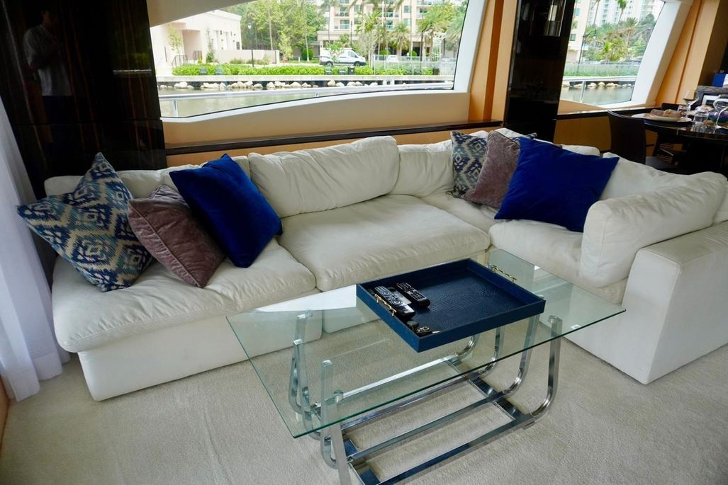 The 84' Epitomizes Comfort and Luxury with both her Interior and Exterior Spaces Boarding from the Aft deck you are greeted by teak decking, a comfortable settee with teak table and seating for eight. Enjoy a game on the Flat Screen Samsung TV and grab a cold beverage from the fridge, new in 2022. Enter into the Main Salon through the glass sliding doors that can completely open to allow you to bring the outdoors in.