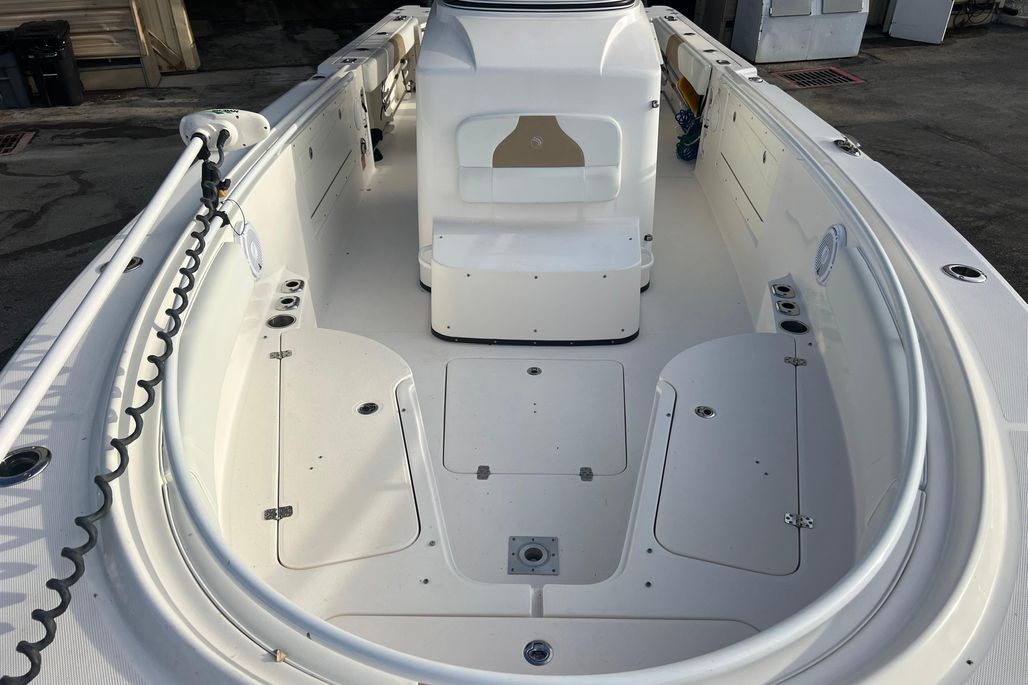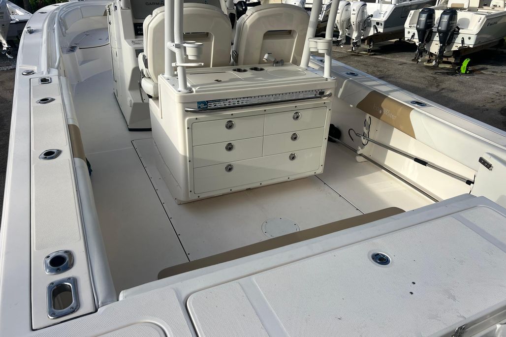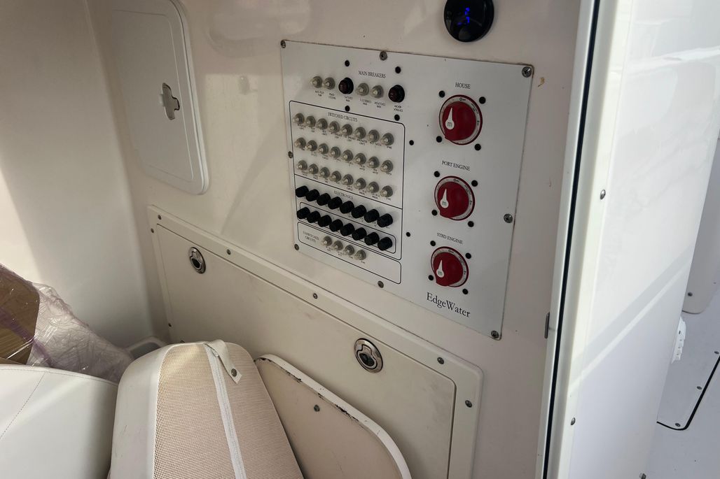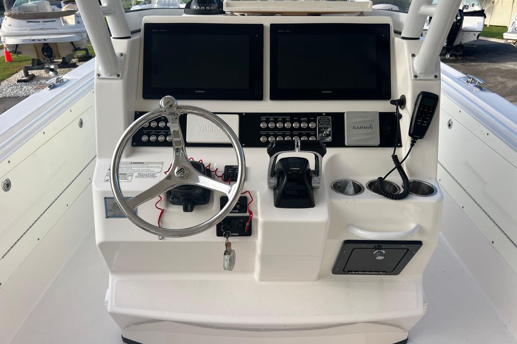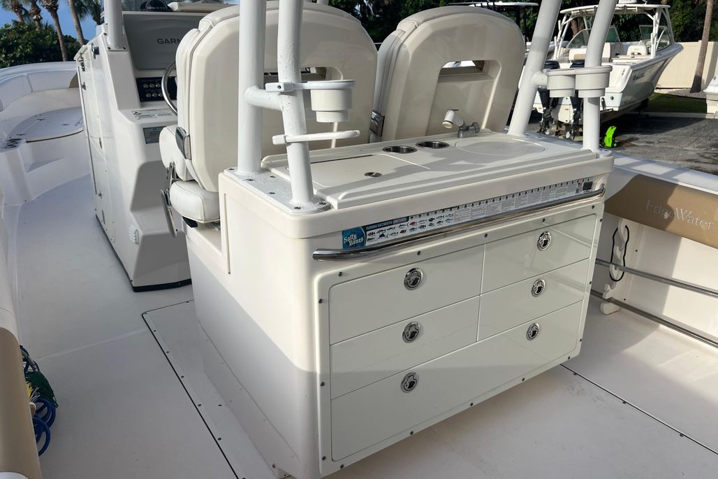 This 2015 Edgewater 320CC is in excellent condition and comes with the 2018 Amera Trail Trailer. This Trailer has Electric Over Hydraulic Brakes and the Bunks were replaced in 2025. The boat is powered by twin 300 HP Yamaha 4-Strokes with only 550 hours on them. The boat is kept in a high and dry and gets cleaned regularly, all the cushions are stored in the console so they are in excellent condition. There is a very nice Electric Head in the Console with Overboard Discharge. It has an awesome electronics package including twin Garmin 7416XSV Multi-Function Displays, Auto Pilot, Radar 24" XHD Dome, VHF Radio, JL Audio Stereo, and Battery Charger w/ Shore Power Connection. It is also equipped with some very nice accessories such as the Rhodan Trolling Motor w/ a New 2025 Lithium Battery (Abyss). This is a 96" Shaft. TACO Outriggers w/ Telescoping Poles & Anchor Windlass. The boat has an awesome windshield that is built in to the Console, hard Top & Frame giving you excellent protection and incredible visibility. If you are looking for a boat like this you must come and see this one!