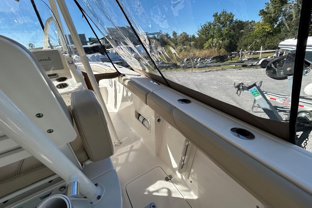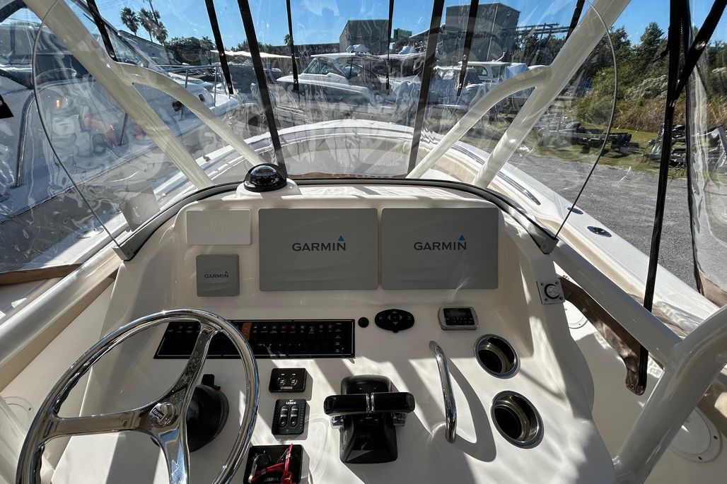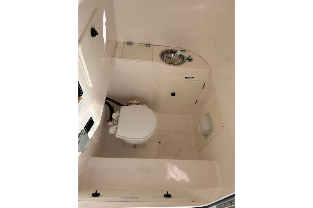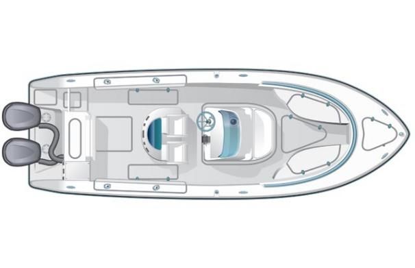 The head compartment within the console features room for storage and contains a manual head with holding tank, pumpout and macerator. The forward console seat base houses a 140-quart cooler and features a plush three-inch thick seat cushion. The molded-in split bow and companion seating affords additional seating as well as unobstructed bow access for anchoring, docking or casting.