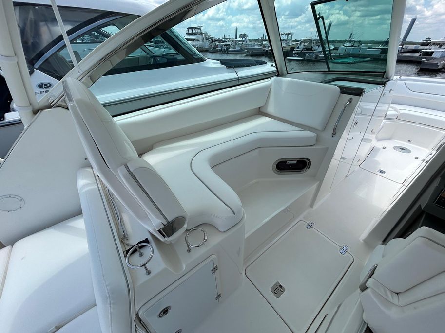 The DC 325 combines central utility, a starboard side helm center and tremendous seating functionality with exquisite Pursuit appointments. The DC 325 features an open bow design with full wrap-around seating, plenty of storage and a unique ladder system forward designed for exiting the boat straight to your own private beach. The fully integrated fiberglass hardtop with visor is engineered with a tempered glass windshield system, composite frame forward and bonded to the fiberglass hardtop. Port and starboard glass is fixed in a white, powder-coated aluminum frame complete with recessed enclosure track. The port side wrap-around lounge, double-wide helm seat, cockpit seating and forward bow seating offer plenty of available spaces to satisfy everyone’s favorite spots to ride along or run the DC 325. The dual consoles open to reveal port-side dedicated equipment storage and lounging area along with a starboard side head accessed via innovative, dual action door systems.
