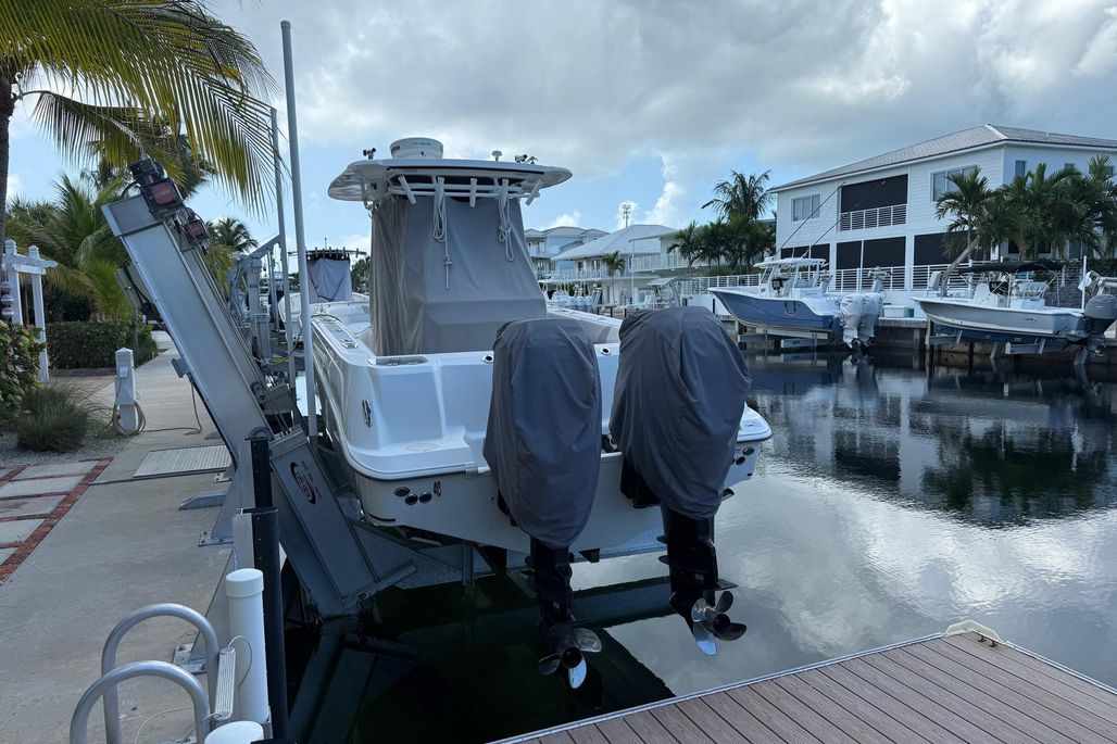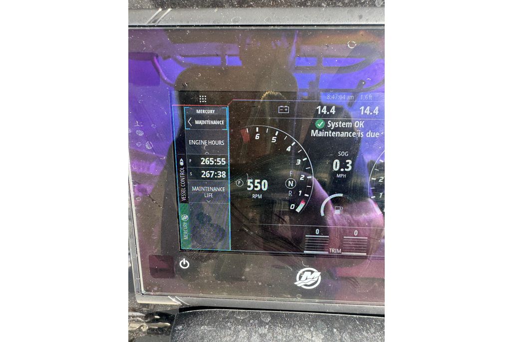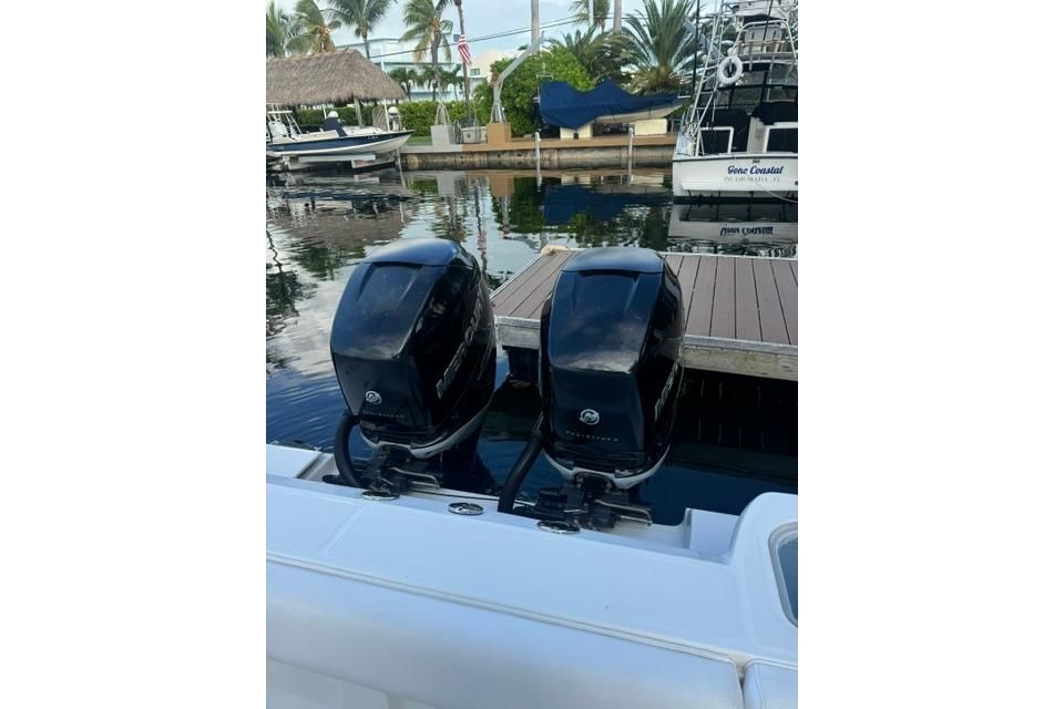 Powered by twin 300 Mercury Verrado outboards with under 350 hours on them. Low hours in this range are nearly “break-in” territory — essentially like a late model engine with much life ahead. - Design & Construction