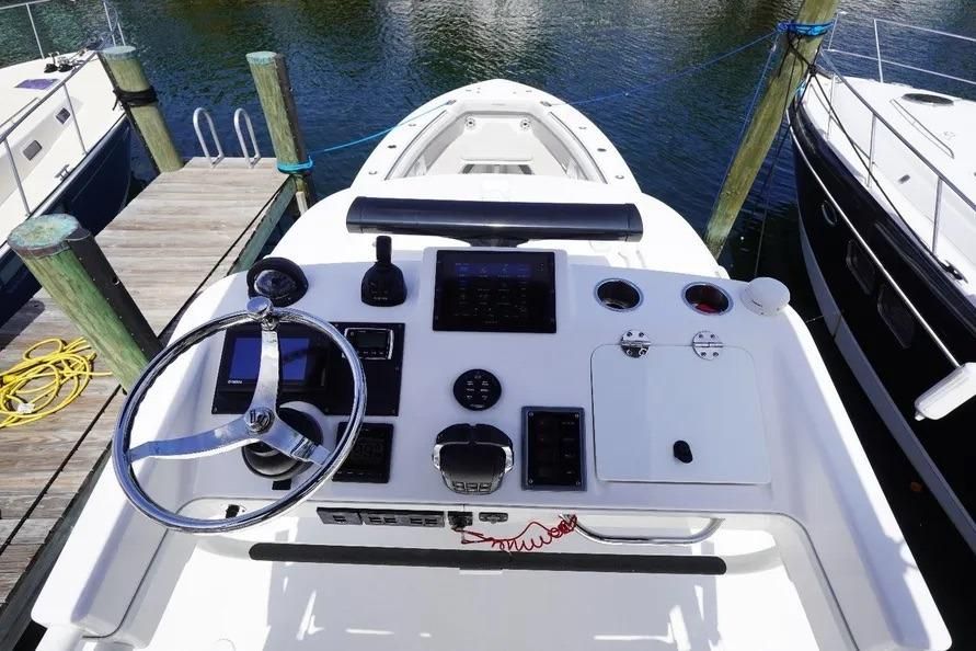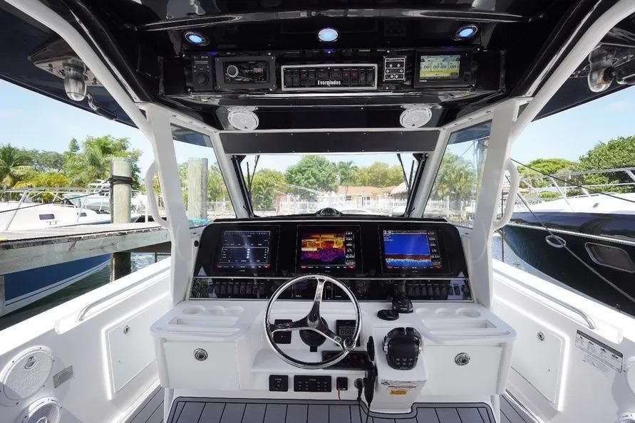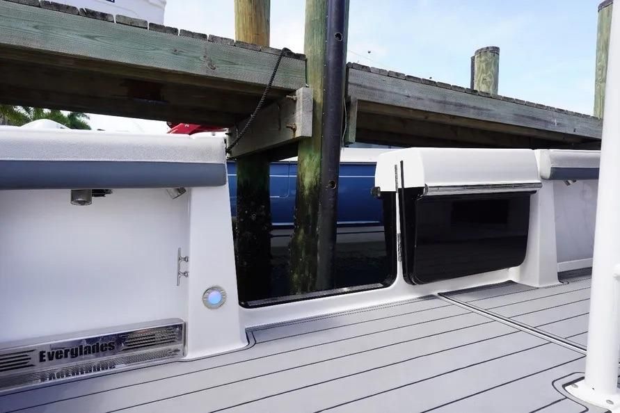 This Everglades 435 CC pairs big-water performance with a fully appointed deck for tournament runs and long family days. Quad Yamaha F350s with Helm Master joystick make close-quarters handling intuitive and carry a fast, dry ride (seller-reported) at speed. A 12-foot beam opens the cockpit for work or play, while forward seating and an electric bow table convert the bow from casting zone to sundown lounge in seconds.