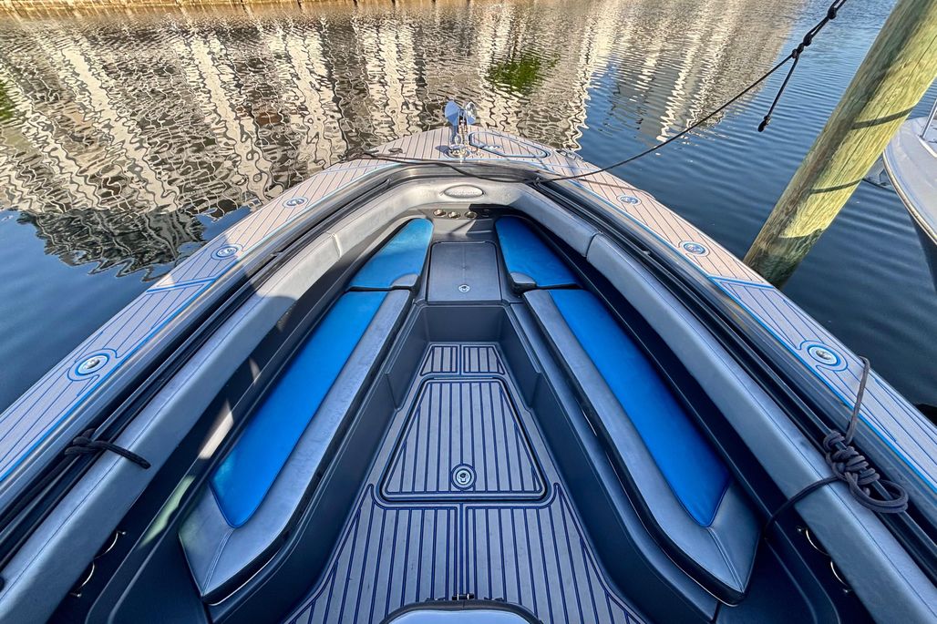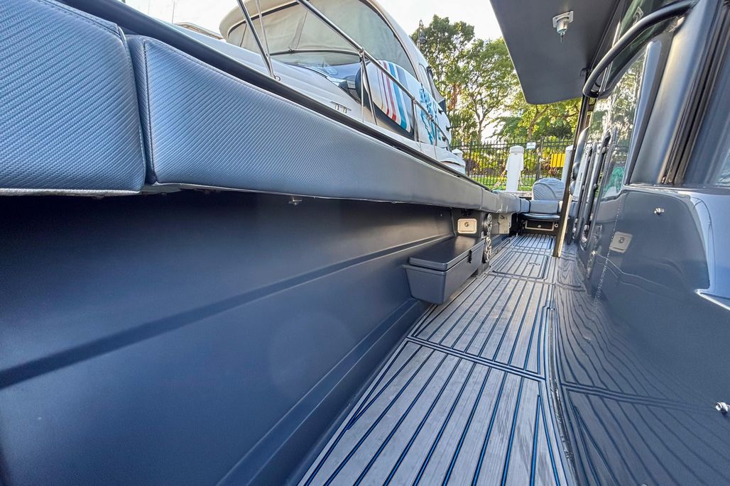 Full custom marine decking throughout with blue inlay accents