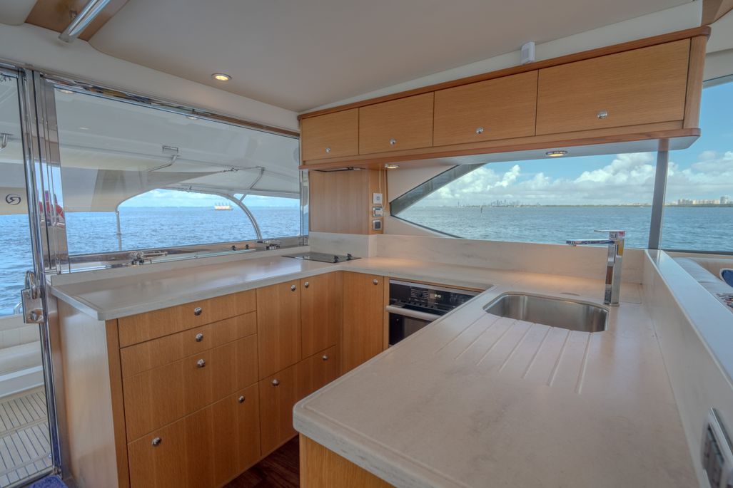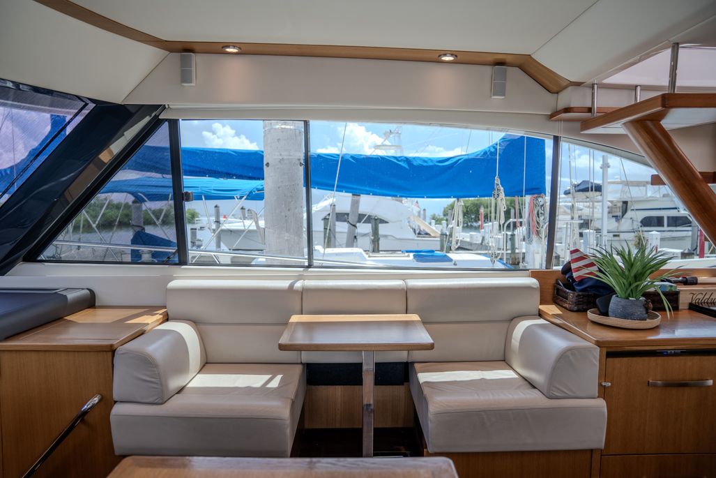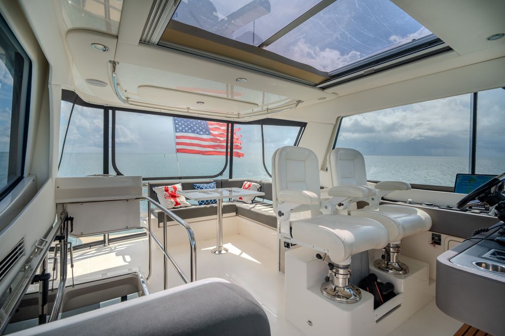 Step aboard a luxury "sky lounge". The climate-controlled enclosed flybridge is a virtual second salon, offering panoramic views, a wet bar, premium entertainment, and comfortable seating for a crowd. Navigate with ease from the forward helm, featuring a modern glass cockpit with triple Garmin displays, or use the optional aft joystick station for precise docking and close-quarters maneuvers.