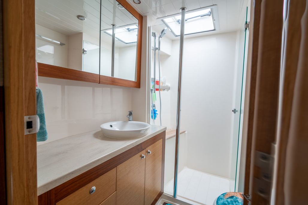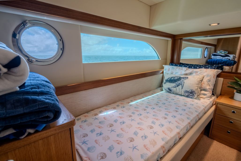 Uncompromising comfort below deck. After a day on the water, retreat to the three-stateroom, two-head layout, which comfortably sleeps six. The master stateroom boasts a queen bed with ample cedar-lined storage, ensuring a restful night's sleep on extended stays.