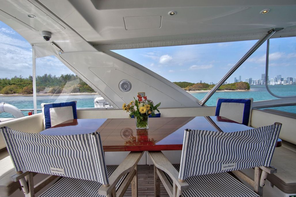 On the main aft deck, guests will find another inviting dining and entertainment area with a high-gloss dining table, built-in seating, a raised portside wet bar with sink and refrigerator, and sliding glass doors leading to the salon. A starboard aft docking station with throttle and bow/stern thruster controls provides convenient maneuvering capabilities.