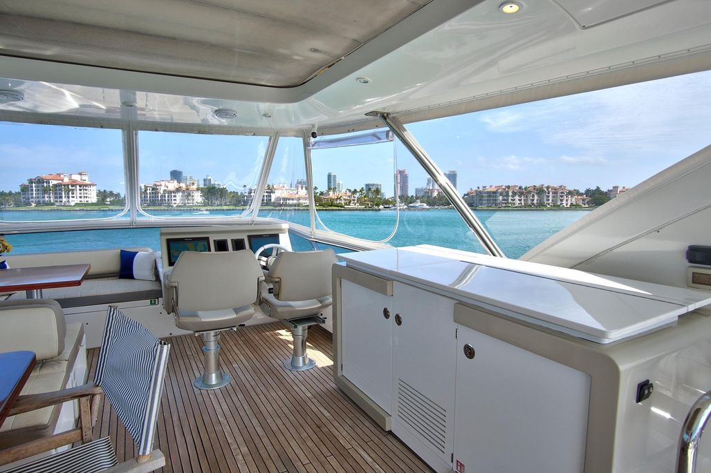 The flybridge is a standout space—large, open, and fully equipped for everything from casual lounging to elegant dining. Amenities include a retractable sunroof, surround-sound stereo system, overhead and floor lighting, multiple seating zones, a high-gloss dining table for eight, a forward seating area with an additional dining table, and a complete wet bar with sink, refrigerator, ice maker, and Kenyon grill/cooktop. A custom removable Isinglass enclosure ensures comfort in both sunny and inclement weather.