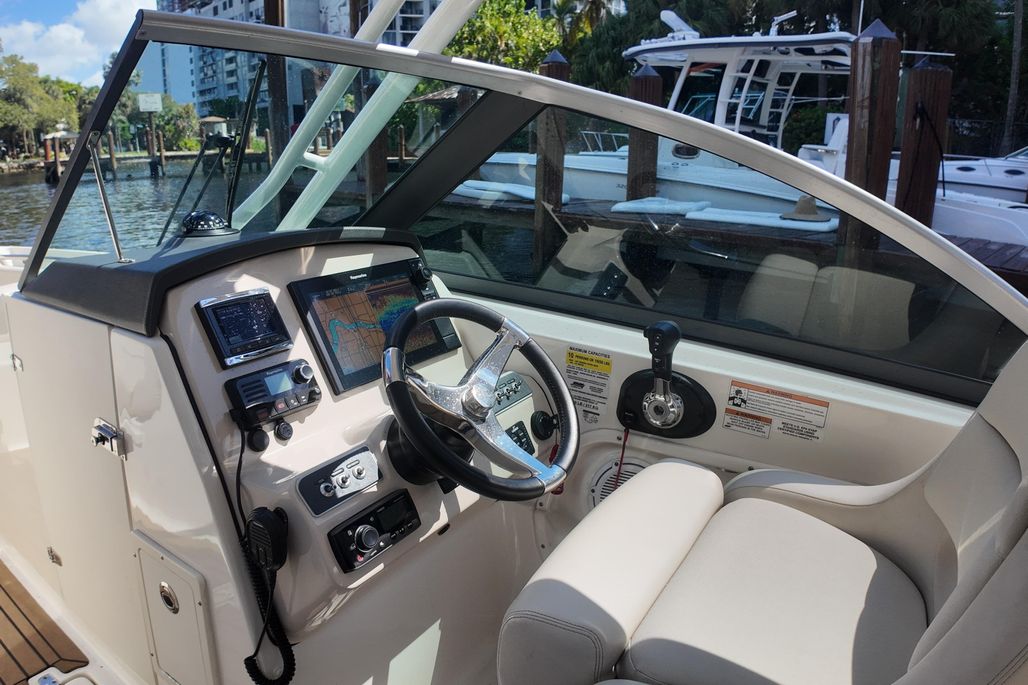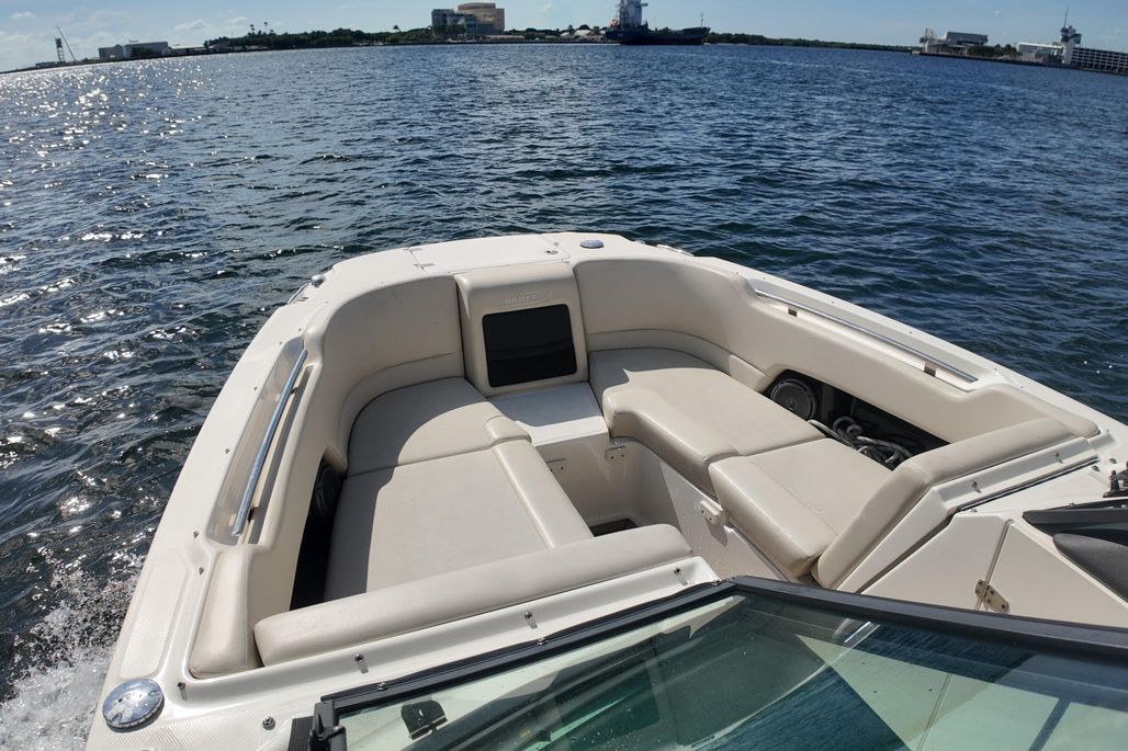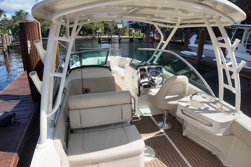 With just 100 hours on its powerful Mercury 300 engine, this boat has been lightly used and meticulously maintained. The vessel features a factory hard top, has never been bottom painted, and includes a beautifully upgraded teak cockpit, making it both stylish and practical for family cruising, fishing, and watersports.