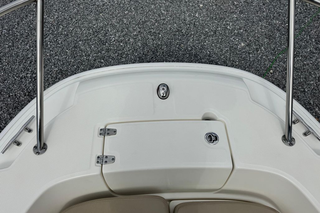 - Lockable bow storage under forward starboard seat with overboard drain and stainless steel gas shock