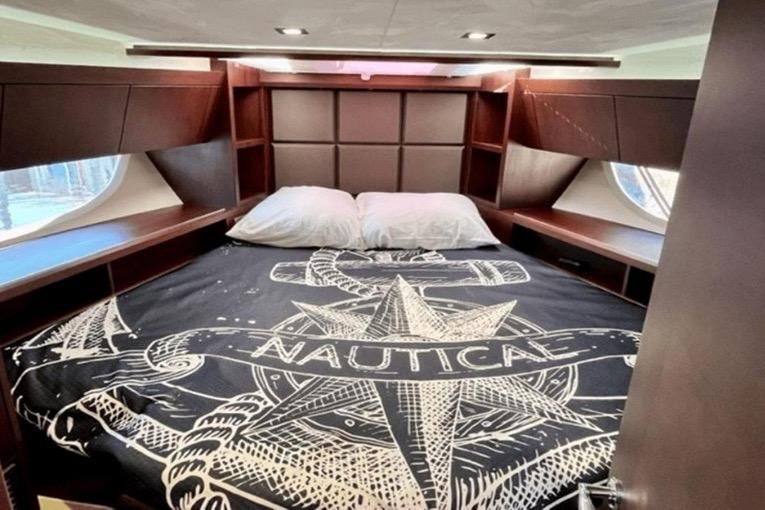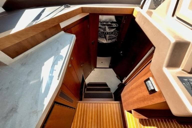 Inside, the yacht showcases Galeon’s signature bright, open salon with panoramic windows, an elegant teak salon floor, and newly updated interior elements including new upholstery, a new helm seat, and a new Samsung smart TV with lift. The striped walnut finishes and electric side windows create a warm, luxury atmosphere, complemented by new salon carpeting and the Galeon Comfort and Luxury Packages.