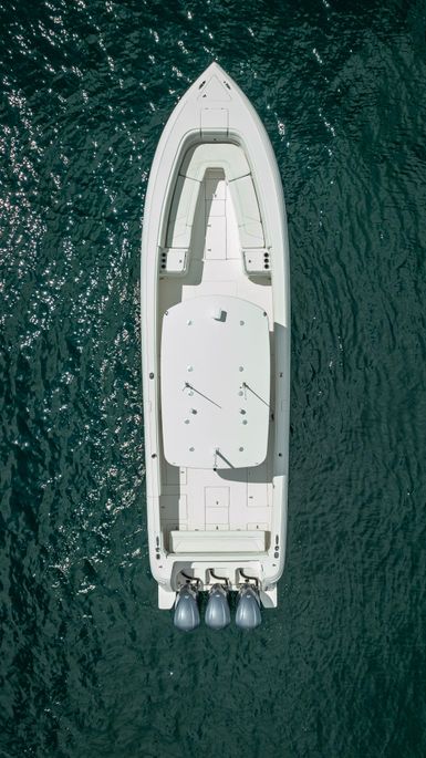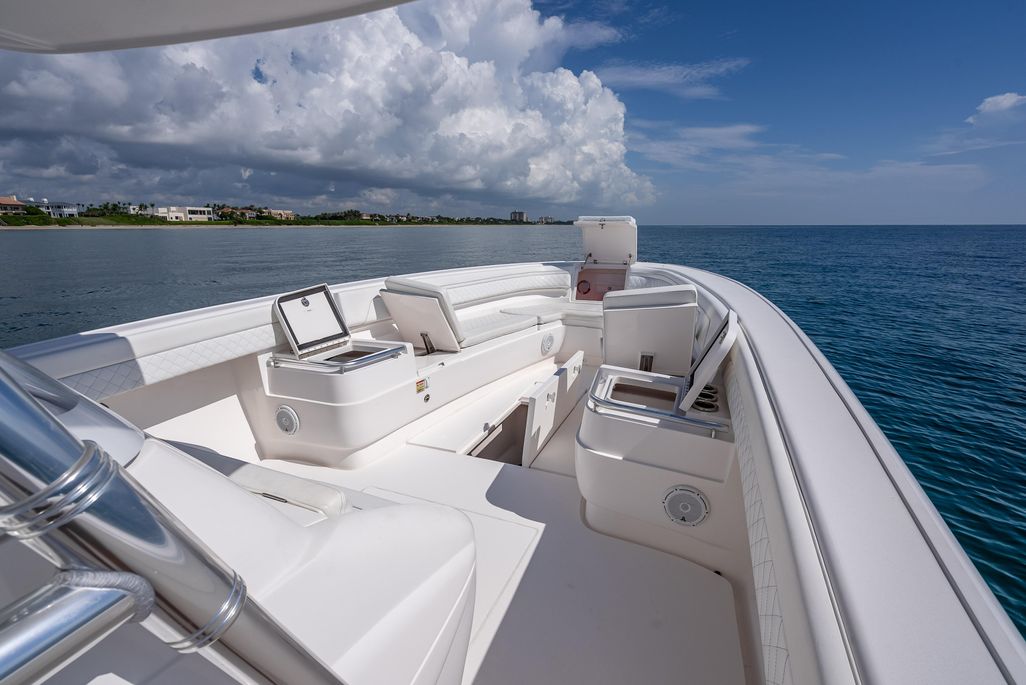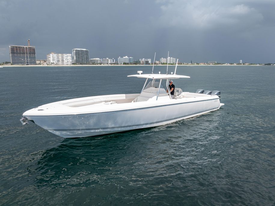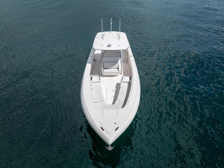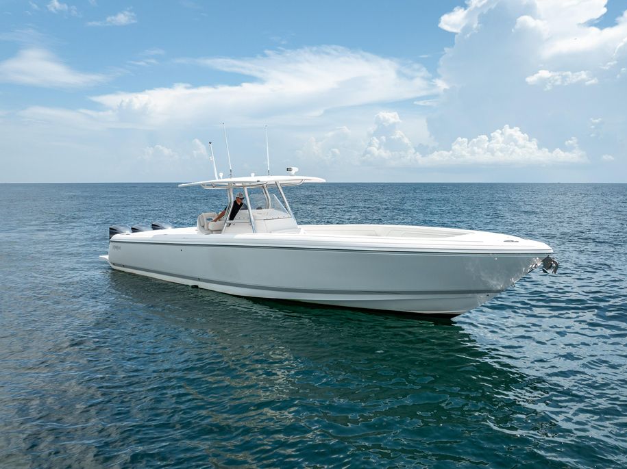 The bullet-style console, an innovative, aerodynamic design to maximize visibility, exudes the sheer power and style of this 400 Center Console. At the helm, with optional power seating, tilt wheel and seating choices, a massive dashboard features the latest flat screen technology and ergonomic accessory switches installed to the owner’s preferred specifications.