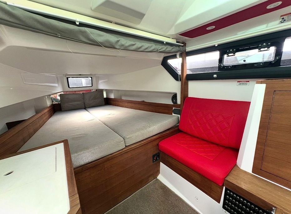 Inside, the forward cabin sleeps two and includes a private head (toilet and sink), with an optional aft cabin allowing for additional overnight guests. With seating for up to 12 and a spacious, shaded deck thanks to the extended Sun Top, this boat balances comfort, style, and function beautifully.