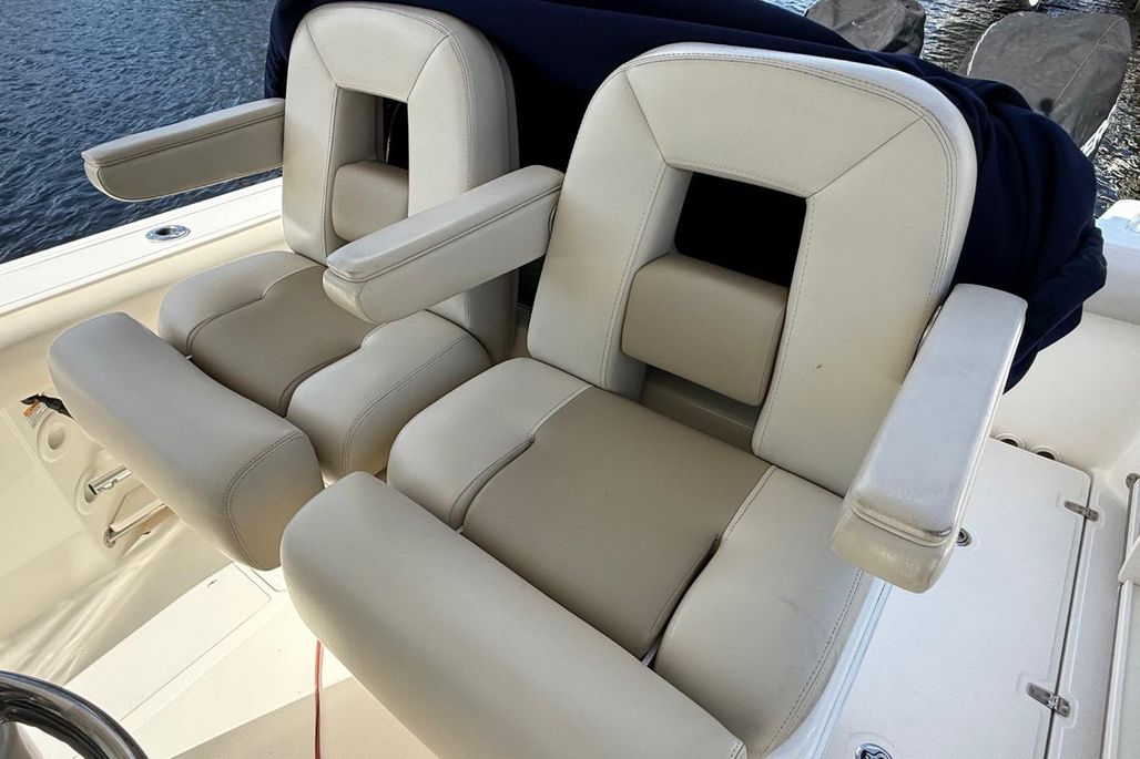 - Deluxe helm seat upgrade provides adjustable captain’s chair and stationary companion seat.