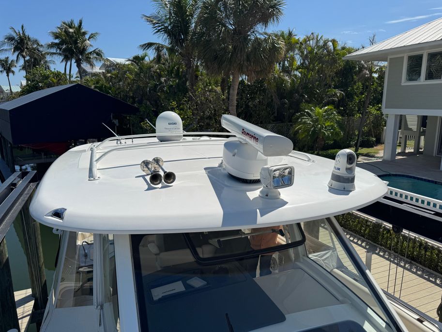 - Electric bow table, custom paddleboard rack, full enclosure, boat cover, bow shade, retractable SureShade integrated into the hardtop