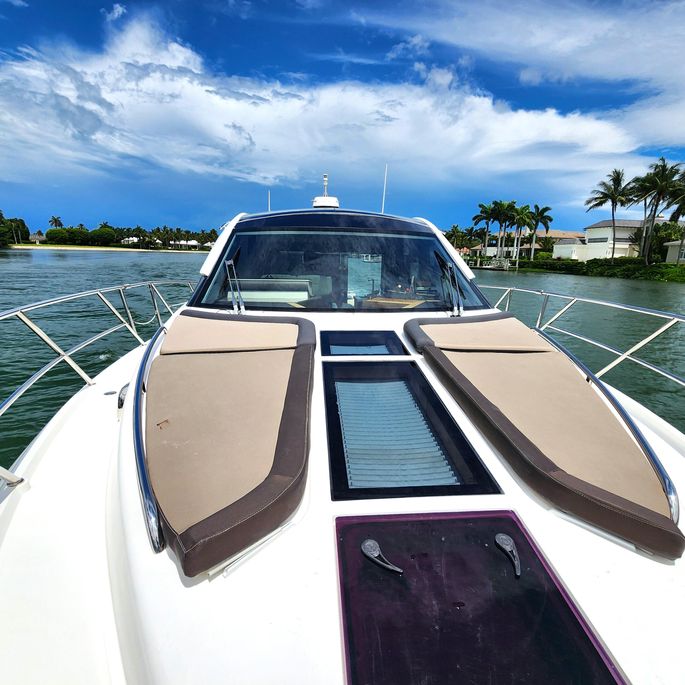 The 3 stateroom, 2 head layout makes for a perfect long range cruiser, or a fun dayboat. She performs well, and offers a modern style, which is comfortable and fun for all of your guests. When boarding' there is an L shaped settee in the cockpit, a large glass door into the large main salon which has a C shaped settee and love seat. with galley to port and helm to starboard. Below deck to port is a guests stateroom. To starboard is another stateroom with a full head and shower. Foreword is the master stateroom with an ensuite head.