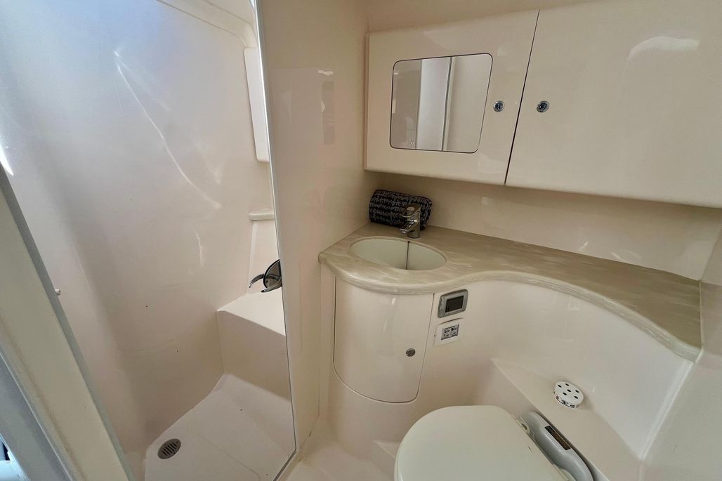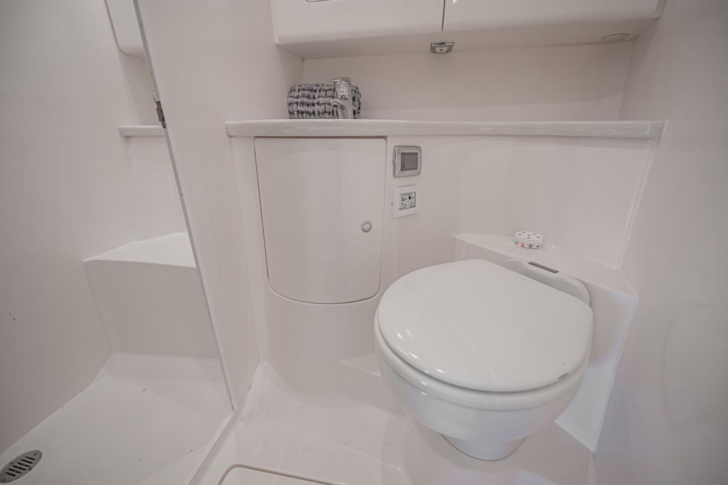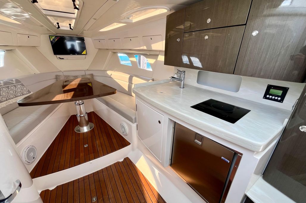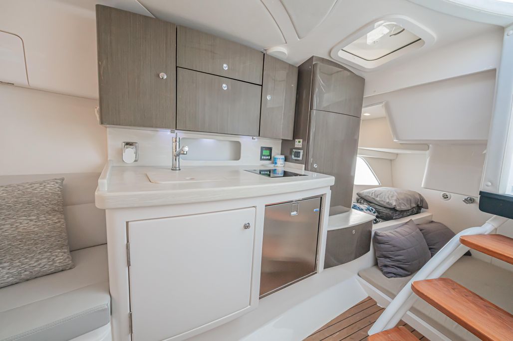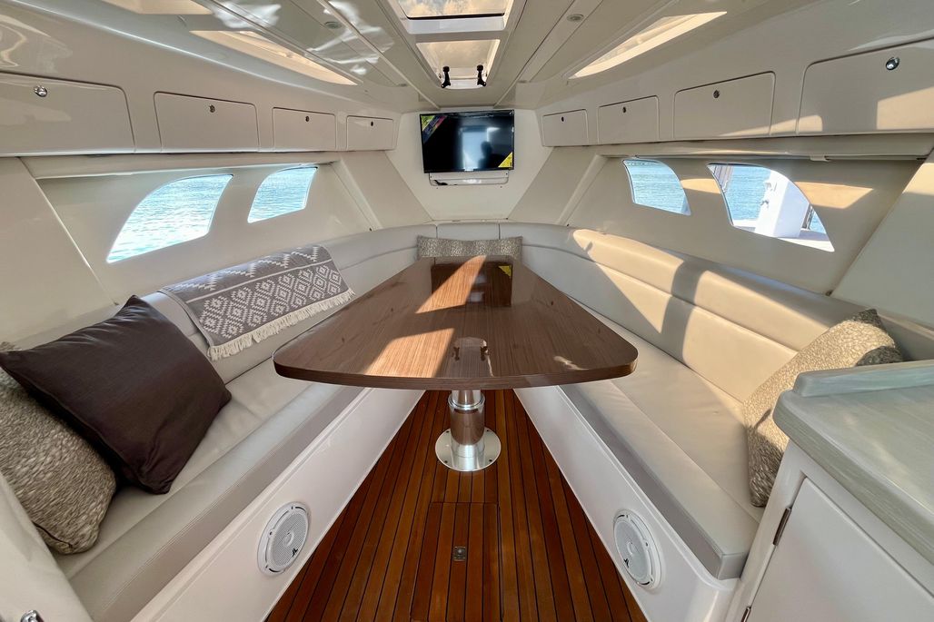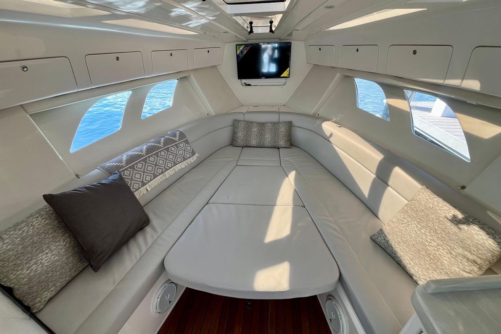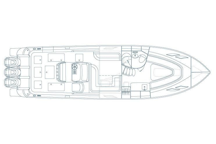 Sleek and stylish, the 407 CUDDY offers all the enhanced accommodations you would expect in a luxury performance cruiser. From a private head with shower stall and separate master berth with queen bed and hullside windows to a forward cabin section that easily converts to a large double berth. But none of it comes at the expense of the most advanced technology and fabrication techniques that deliver an incomparably smooth, dry ride with unparalleled performance. For divers and swimmers, it’s packed with thoughtful design features like a hullside dive door with step ladder and grab rails. Entertaining is elevated with cozy, custom seating and a stylish wet bar while serious sport fishermen will take note of the baitwells, rod holders, tank storage, tackle boxes and raw water washdown.