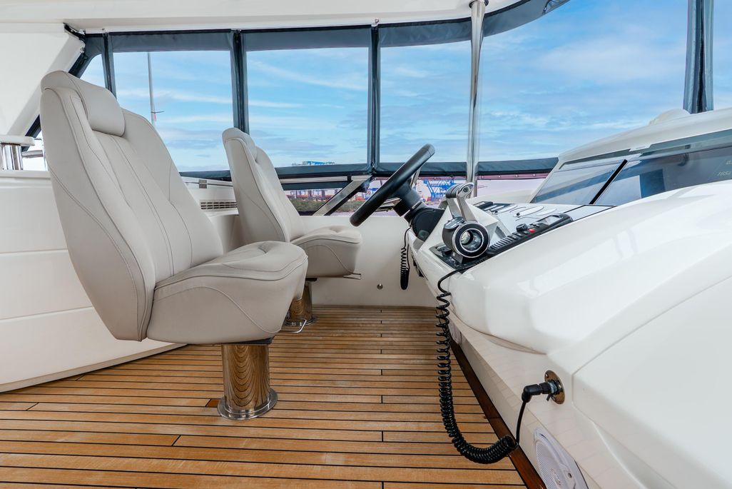 The lower helm is designed for both functionality and inclusion. The primary driving and navigation stations are to starboard, while to port, a raised L-shaped seating area allows guests to join the captain in comfort—fostering a uniquely social cruising experience. The helm also includes a side door for direct access to the starboard deck.