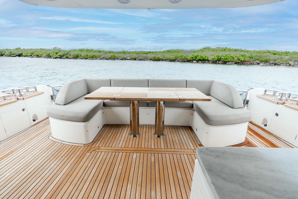 Forward, the walk-through foredeck offers a serene escape while in harbor or an exhilarating perspective when underway. Thoughtfully enhanced, this area now features a beautifully designed lounge with forward-facing seating, sun pads, and ample storage lockers—perfect for day cruising essentials and creating yet another stunning space to relax and unwind.