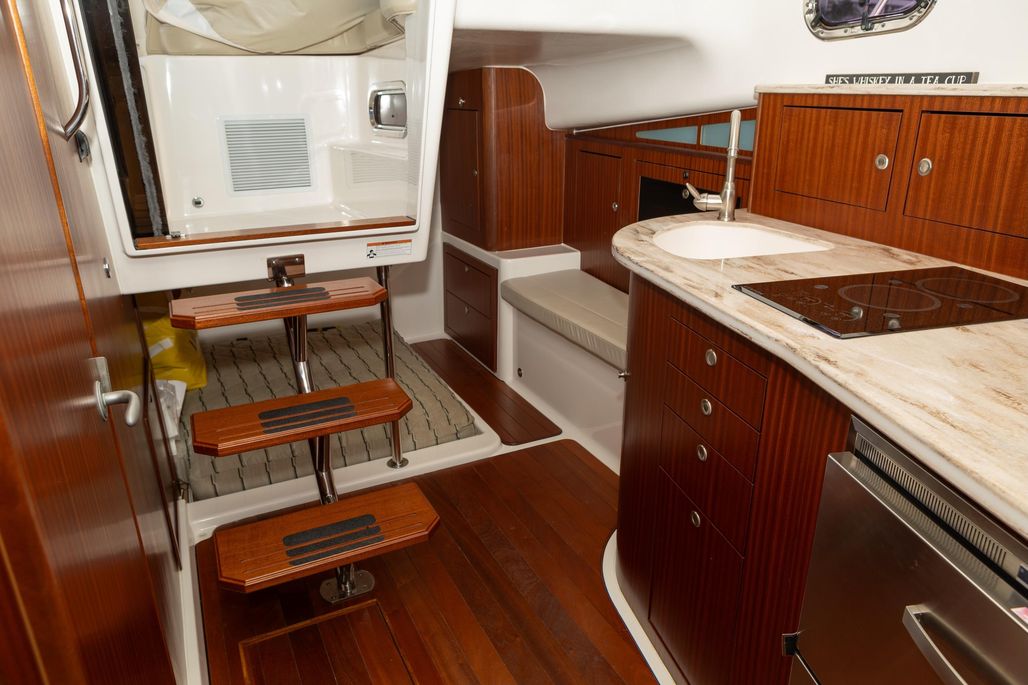 The OS385 offers efficiency & performance with the reliability and durability of Yamaha Outboards. Relax in the climate-controlled helm with a separate helm air conditioner, complete suite of Garmin electronics, full windshield, and comfortable lounge to port. The 13’ beam delivers a spacious cabin offering full galley, ample fridge/freezer space, 2 full berths, dry head, and plenty of cockpit for fishing or cruising.