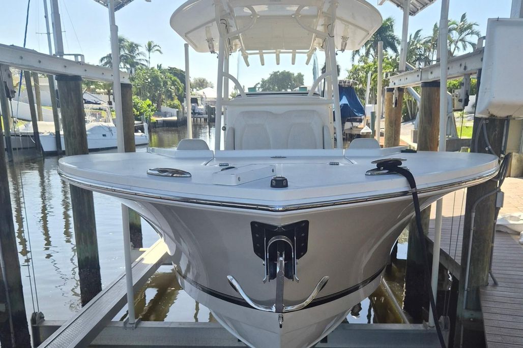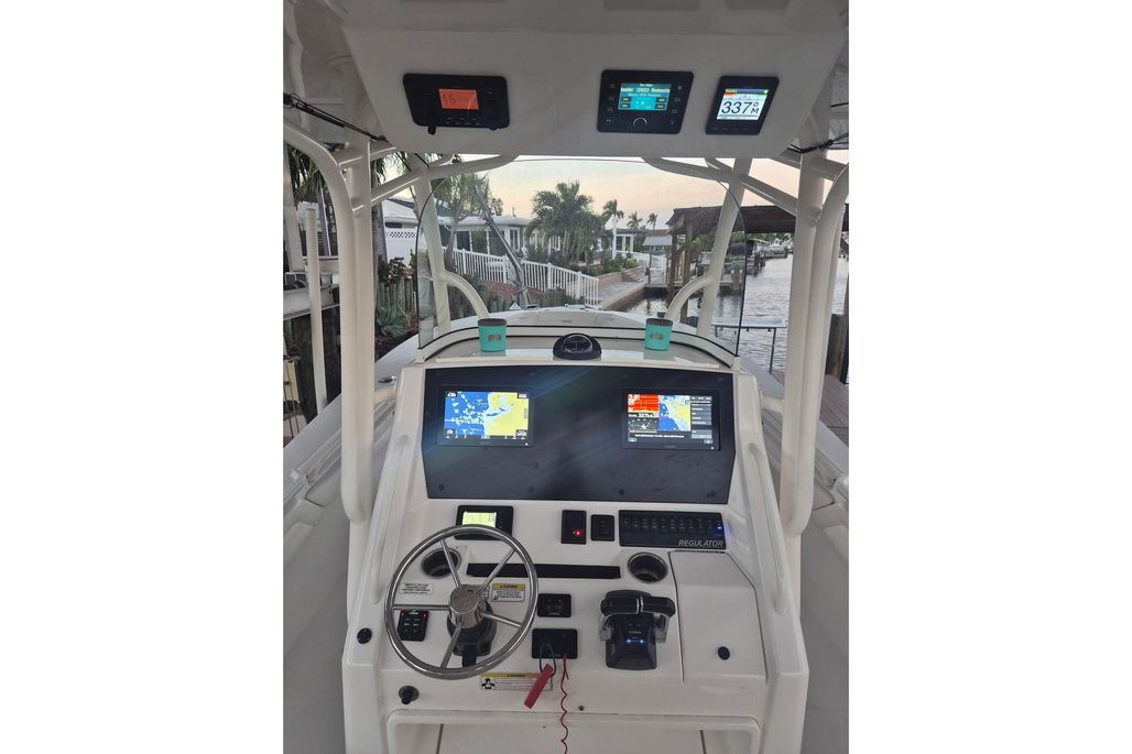 Experience true offshore performance with the 2018 Regulator 28FS. This boat delivers Regulator’s signature smooth, dry ride, whether fishing or cruising. Twin Yamaha F300s provide reliable power, while the tackle center, rod holders, and transom tuna door make it an ideal angler’s setup. Forward seating, a folding transom bench, and integrated cooler offer comfort for family and friends, making this 28FS ready for both adventure and relaxation on the water.
