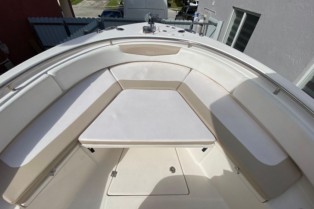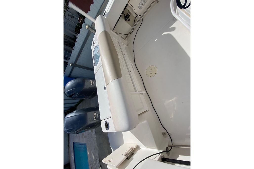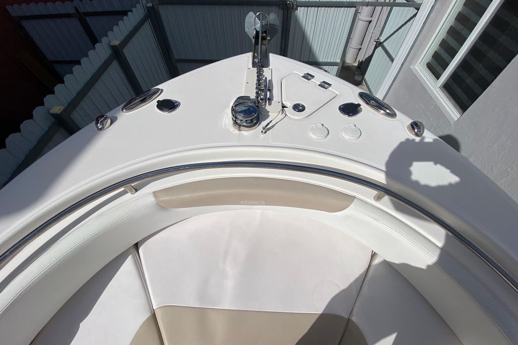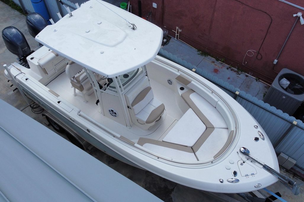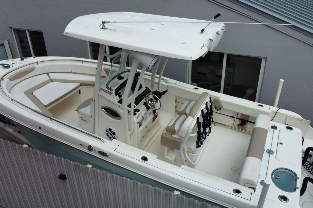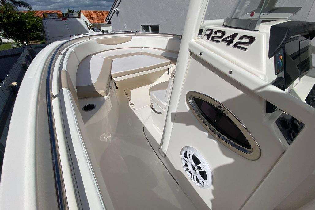 The sensational R242 is one of Robalo's newest center console offering available at No Haggle, Reel Deal pricing. Brace yourself, fish boat design just took another giant leap forward. Upfront, the large casting platform is sure-footed and accessible. In the cockpit, a forward entry privacy head comes standard with a porta-pottie and a screened opening port light. Little extras like LED cockpit lighting, a bow filler cushion and a freshwater cockpit shower are all standard. Serious anglers will appreciate the best-in-class livewell capacity and massive insulated fish box storage. At this length, nobody does it bigger or better. Fully equipped standard, take the R242 up a notch with key options including a fiberglass T-top that comes complete with four rod holders, LED spreader lights and an electronics box.