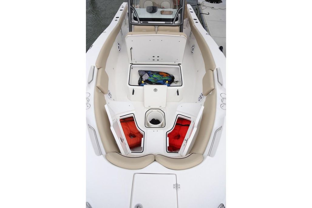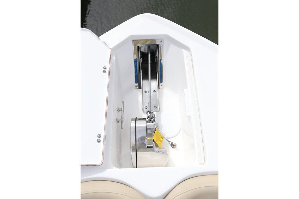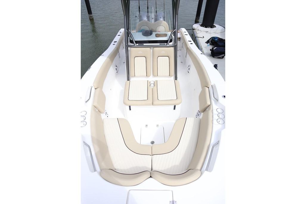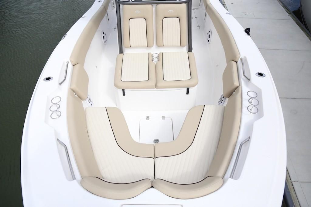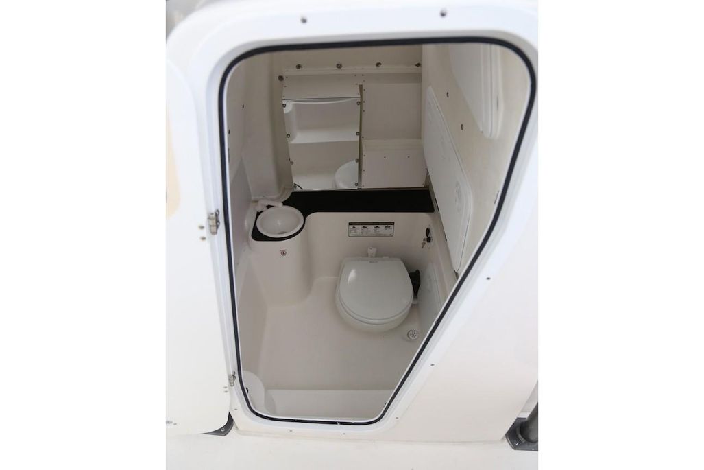 The deep-V hull design ensures a dry, stable experience offshore, while the generous layout provides ample space for fishing and entertaining. Anglers will appreciate the large livewell, dual fish boxes, tackle storage, and multiple rod holders. Comfort features include cushioned bow seating, a forward sun lounge, fold-down transom bench, and a full marine head inside the console.