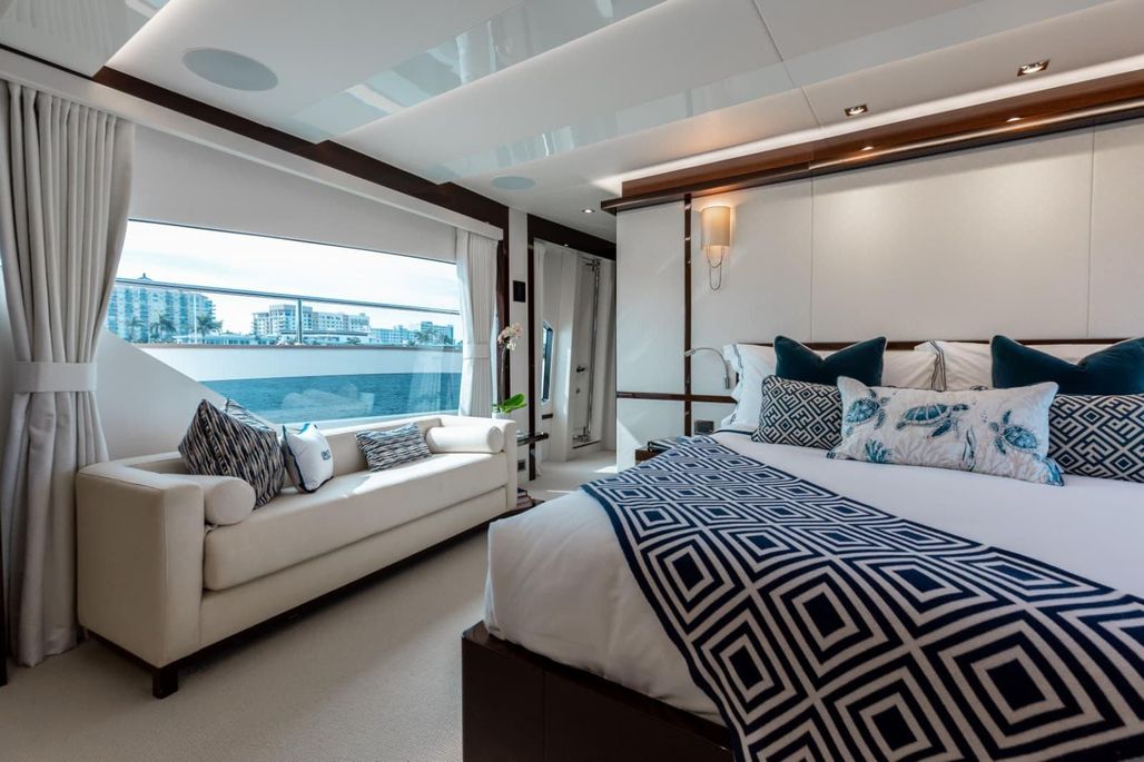 A standout feature is its unique main deck layout with a special master cabin configuration for even greater flexibility and space from a class above. With the luxurious master stateroom berth on the main deck, a forward staircase leads to a mid-level dressing area and sumptuous en-suite. The raised pilot house offers greater flexibility contributing to the more expansive main deck layout which is truly remarkable for this size of motor yacht.