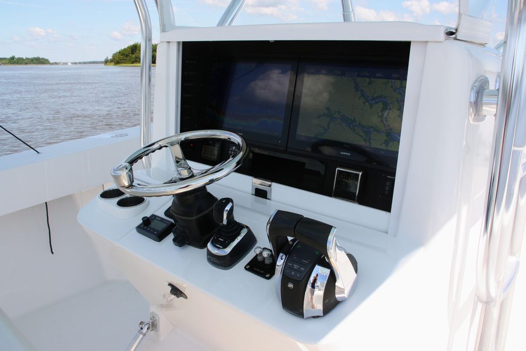With an impressive overall length of 41 feet, this boat is crafted from durable fiberglass, ensuring longevity and resilience on the water. Powered by three Mercury Verado outboard engines, each delivering 350 horsepower, this boat promises exhilarating speed and agility, perfect for adventurous outings. With only 560 hours of use, these engines are in excellent condition, ready to take you on unforgettable journeys.