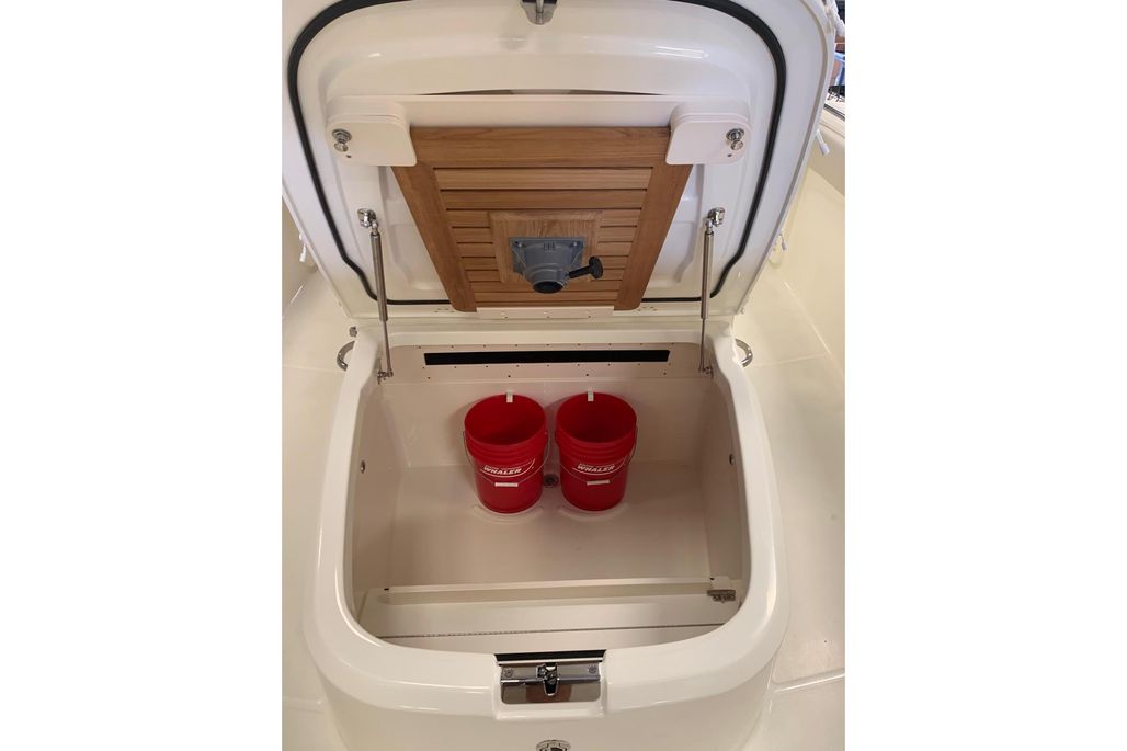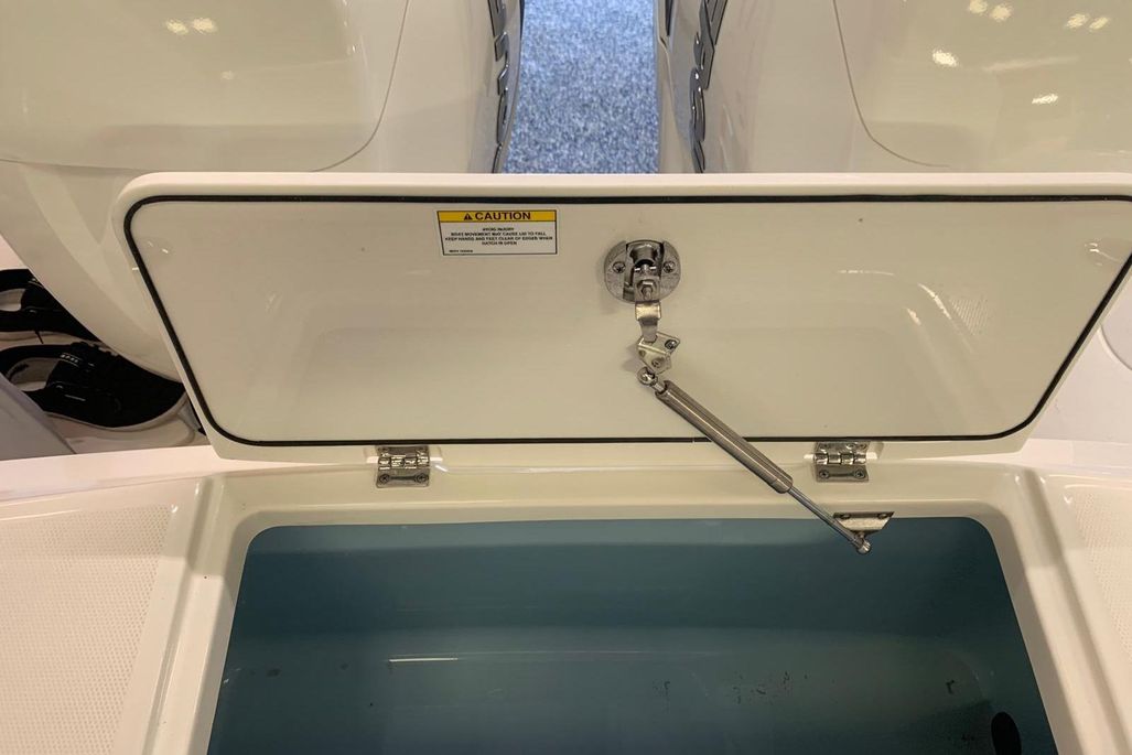 A private enclosed head inside the console with a VacuFlush toilet and storage—super convenient for long days on the water.