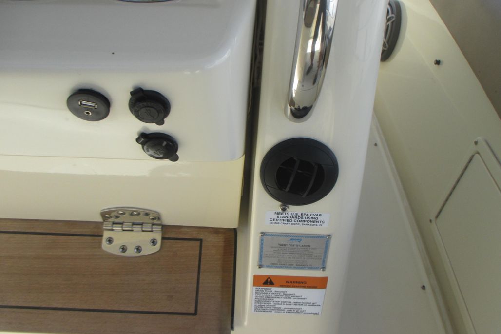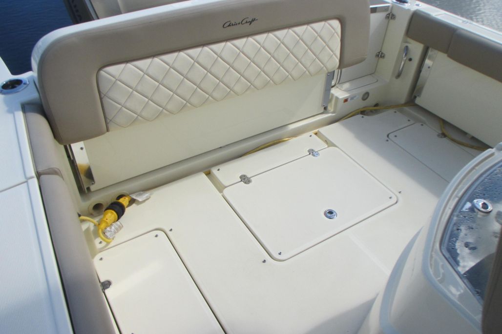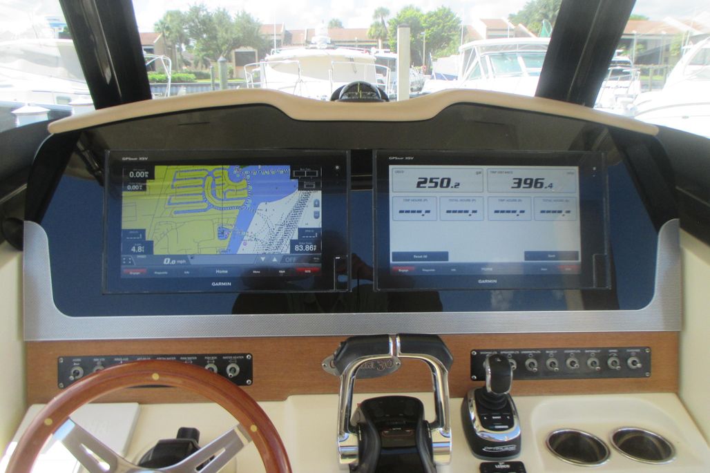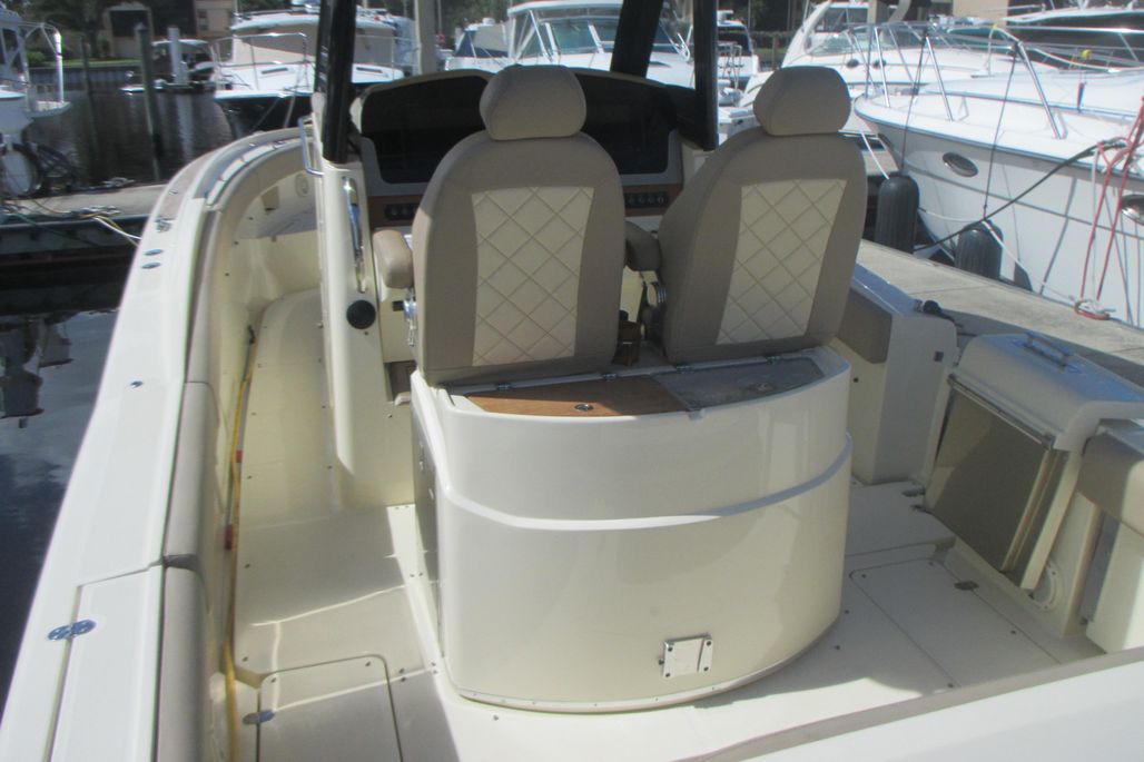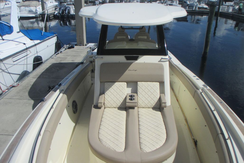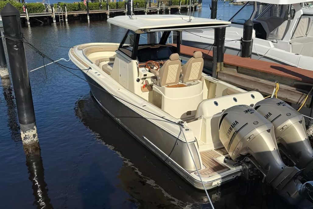 A luxury Center console that can fish, cruise or even weekend on! Beautiful Champagne hull color! Powered with the all new color matched Yamaha 300 HP with Joystick docking! Dometic DC Air Conditioning with vents to the helm and an Inverter, Battery charger, Convertible aft lounge seating. Forward seating with sun pad, Isotherm Cockpit fridge with wet bar and table, Enclosed head with Vacuflush toilet and Vanity and shower, DC water heater, Double berth in cabin, Electric cockpit Sun shade awning, Auto anchor windlass with remote, Dual Garmin 16" screen with GPS plotter, sounder, auto pilot and VHF radio, Fusion Premium sound system with color matched JL audio speakers, Live well, Rod holders, Covers for everything plus a full mooring cover! SPOTLESS!