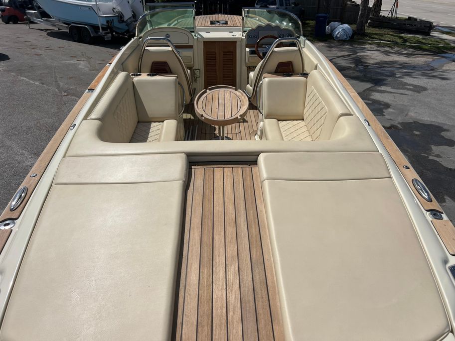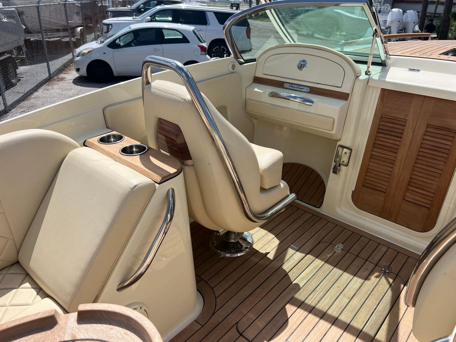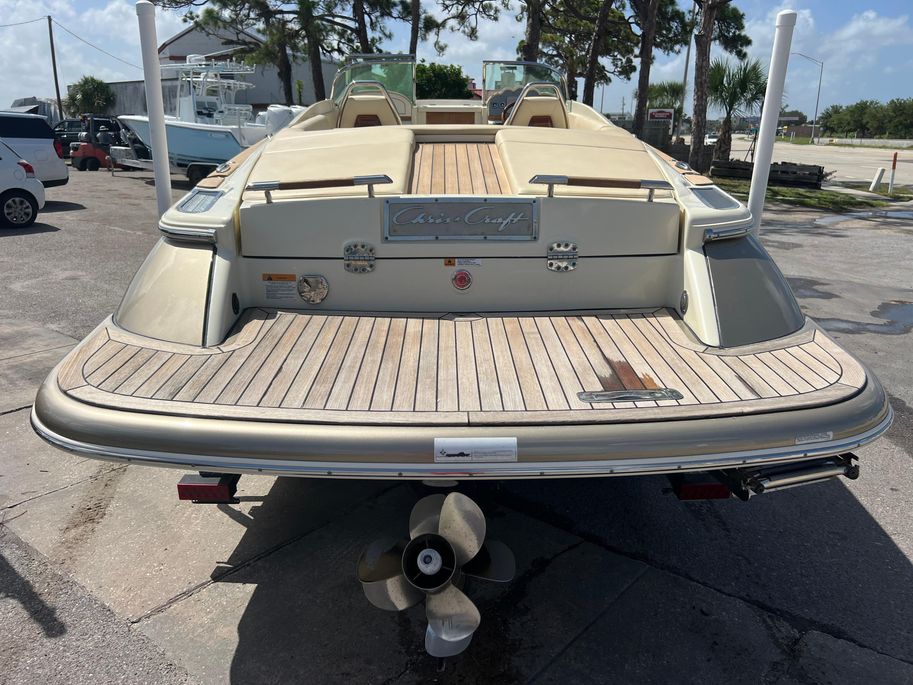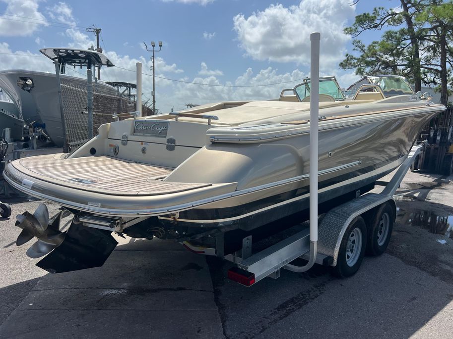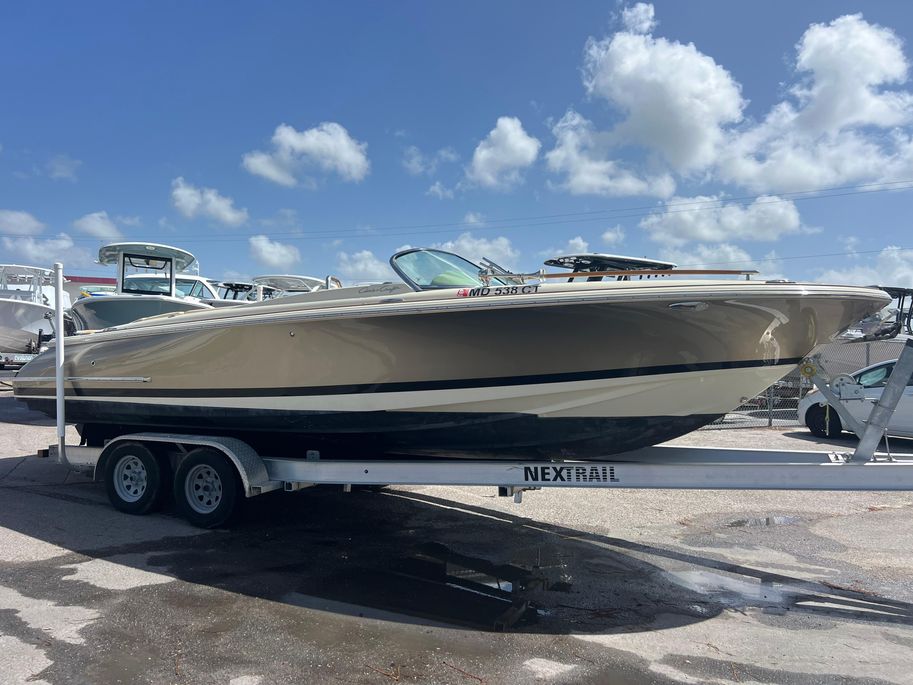 Trailer Included. This 27 Corsair is in excellent condition. The boat has incredible power, the 430 HP 8.2 MAG High Output! Only 168 hours!! This is the Sea Core Engine and Drive Package which is built to withstand Saltwater very well and has a closed cooling system. It is loaded with options including the Teak Cockpit & Swim Platform, Garmin GPS Display, Battery Charging system, Refrigerator, Cockpit Table, Full Boat Cover. Bimini Top, Underwater Lights, and Anchor Windlass. This boat has a beautiful Paint Job giving it a very Rich and Classy look. The interior looks brand new and the Teak is in perfect shape. The Teak gives the boat a super nice feel to it and it looks amazing.