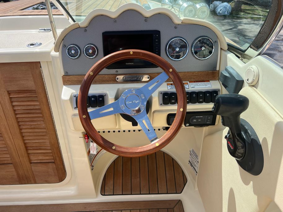 The Corsair 27 perfectly balances beauty, comfort and performance. The long, low, covered foredeck enhances the driver’s vision, while providing a spacious, bright berth tucked below. Within its deceptively trim shape, the Corsair easily accommodates 10 people for day trips or weekend adventures. And with exhilarating horsepower, it arrives in sophisticated style – quickly.