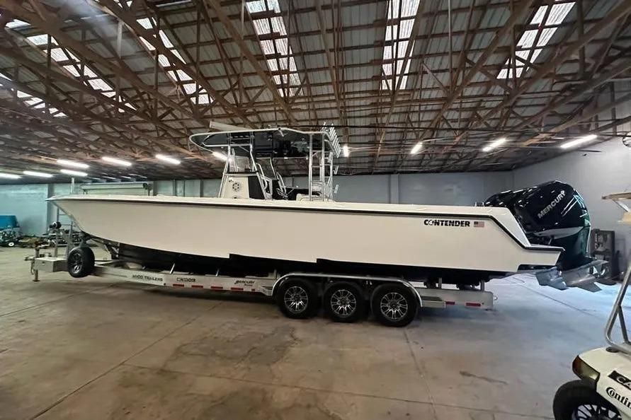 The deck plan is pure Contender: three livewells to stage bait, an actuated coffin box up front, and a starboard dive door for quick water access and easy boarding. Fusion sound with JL speakers keeps the crew energized between spots. Engines have been recently serviced (ECM downloads on request), and the included 2020 MYCO triple-axle trailer has just been serviced and is ready to roll, making relocation or haul-outs simple.