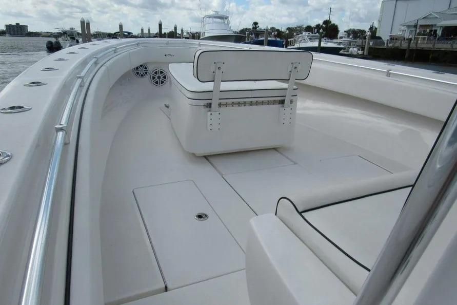 Built to run wide and fish hard, this 39 ST checks the big boxes: an indoor-kept, no-bottom-paint hull finished in white with black accents, true high-30s/40-kn cruise, and serious range on a 500-gal tank. The helm is dialed with a full Simrad package, dual 16" Evo3 displays backed by a 10 kW open-array radar, so plotting offshore routes and tracking weather is straightforward whether you’re tournament-bound or chasing a mid-week window.
