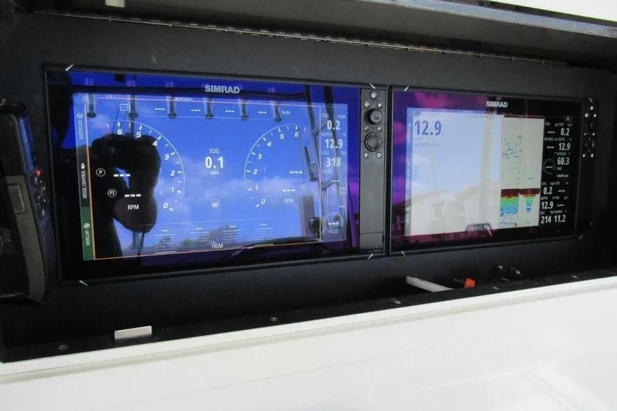 Electronics: Dual Simrad NSS Evo3 16" displays · 10 kW radar · Fusion audio w/ JL speakers