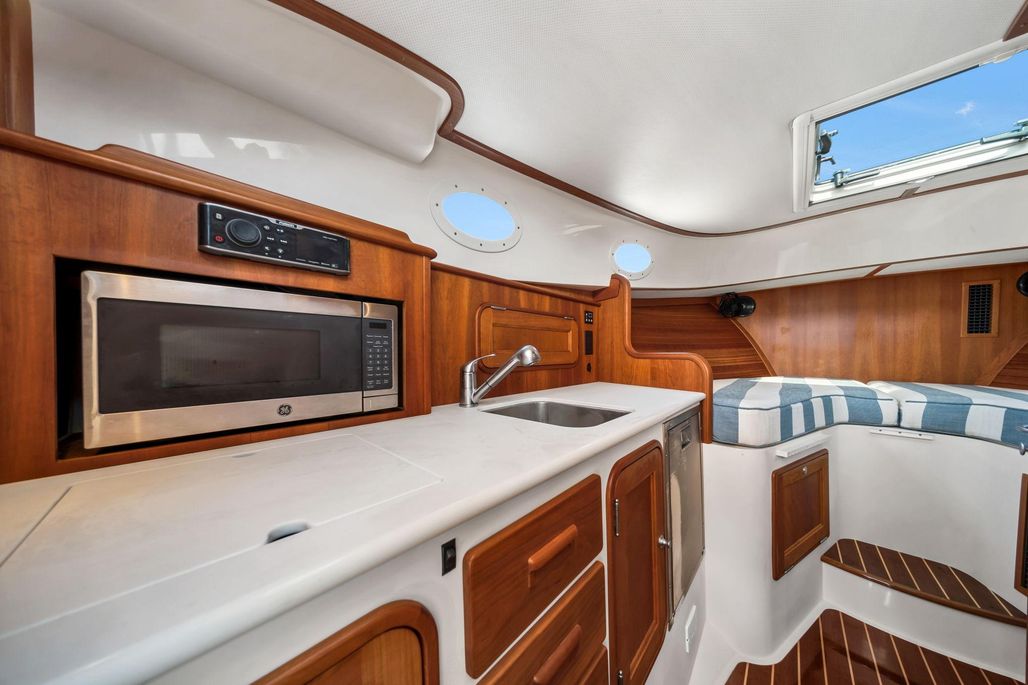 - Storage lockers under V-berth has easy-access cherry drop-front doors